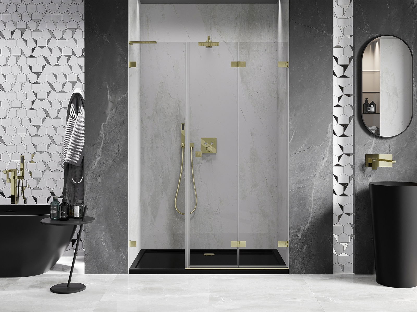 Możliwość składania drzwi, zarówno do zewnątrz, jak i do wewnątrz, pozwala uzyskać więcej przestrzeni podczas niekorzystania z prysznica. Jest to idealne rozwiązanie do mniejszych łazienek, maksymalnie wykorzystujące dostępną powierzchnię.
