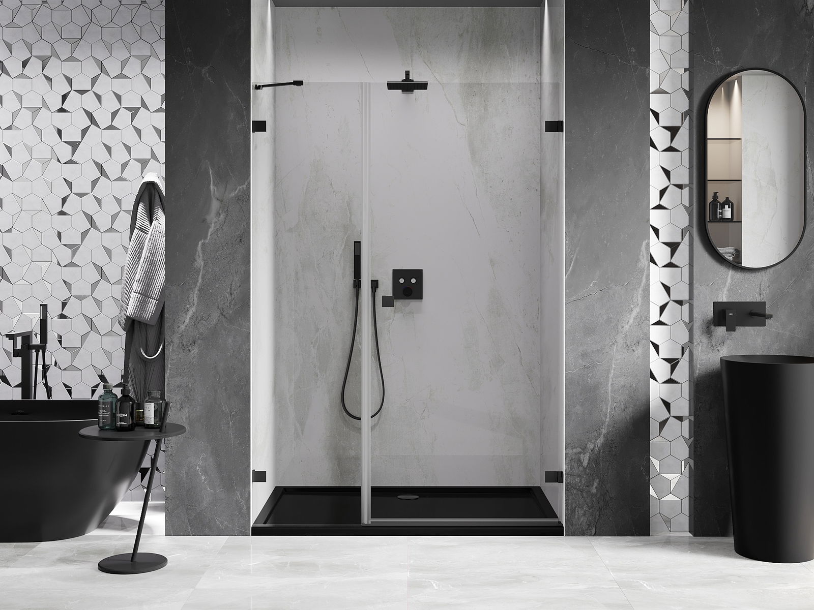 Poręczny i wygodny uchwyt został wykonany z trwałego i odpornego metalu. Modny kształt w połączeniu z wykończeniem dopasowanym do koloru profili nadaje całości nowoczesnego i stylowego wyglądu, podkreślając estetykę każdej łazienki.
