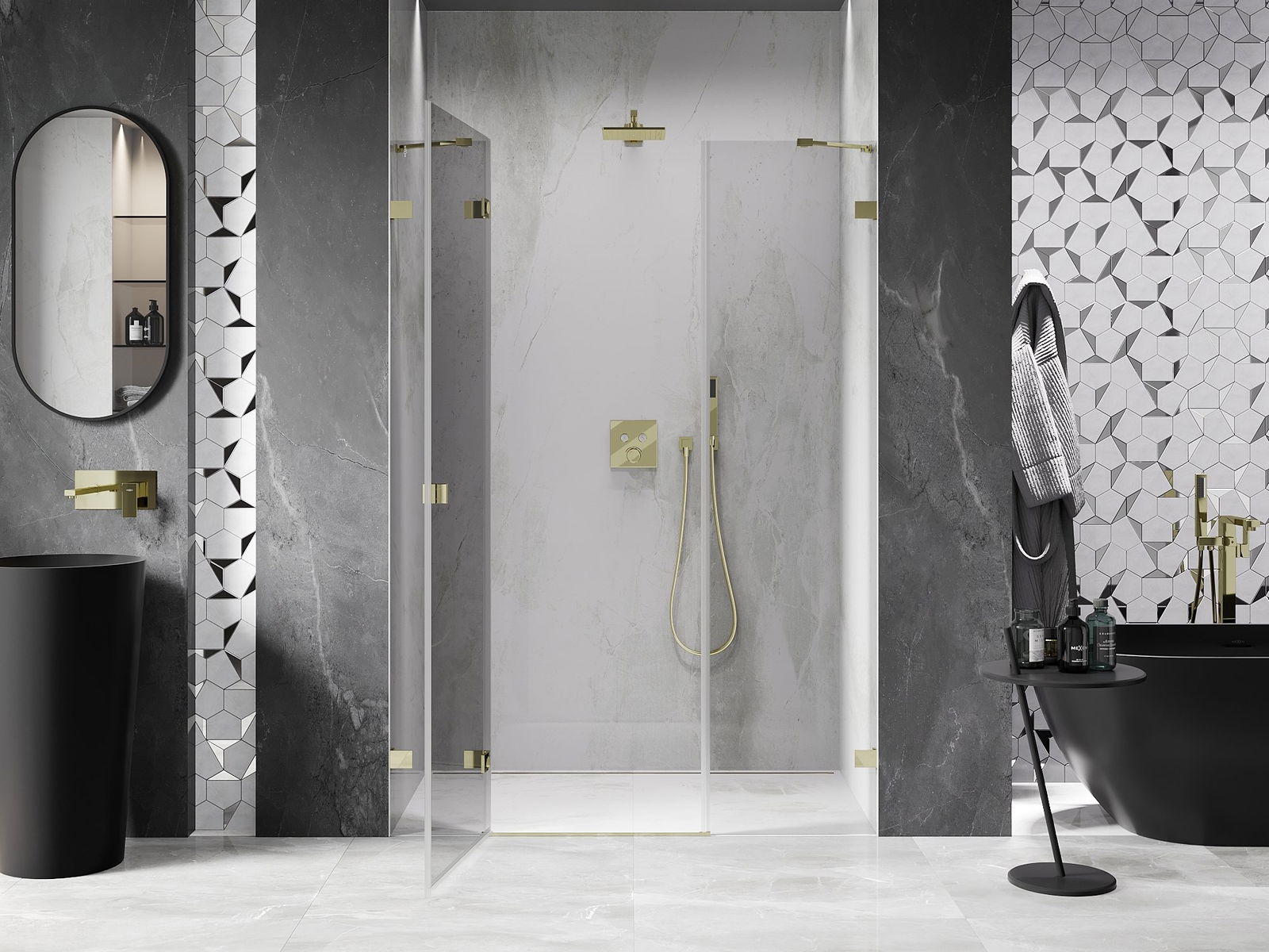 Klamry i zawiasy zostały wykonane z bardzo trwałego mosiądzu, a dodatkowo tworzą zlicowaną taflę szkła. Jest to doskonały wybór, który łączy elegancję, trwałość i nowoczesny design. Dzięki takim rozwiązaniom prysznic zyskuje na estetyce, a jednocześnie ułatwiają utrzymanie czystości.