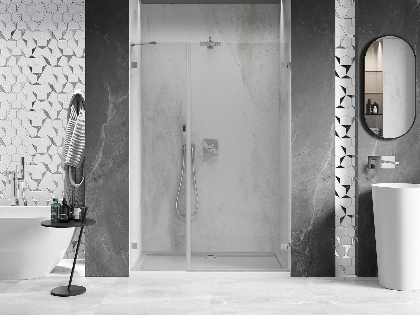 Poręczny i wygodny uchwyt został wykonany z trwałego i odpornego metalu. Modny kształt w połączeniu z wykończeniem dopasowanym do koloru profili nadaje całości nowoczesnego i stylowego wyglądu, podkreślając estetykę każdej łazienki.