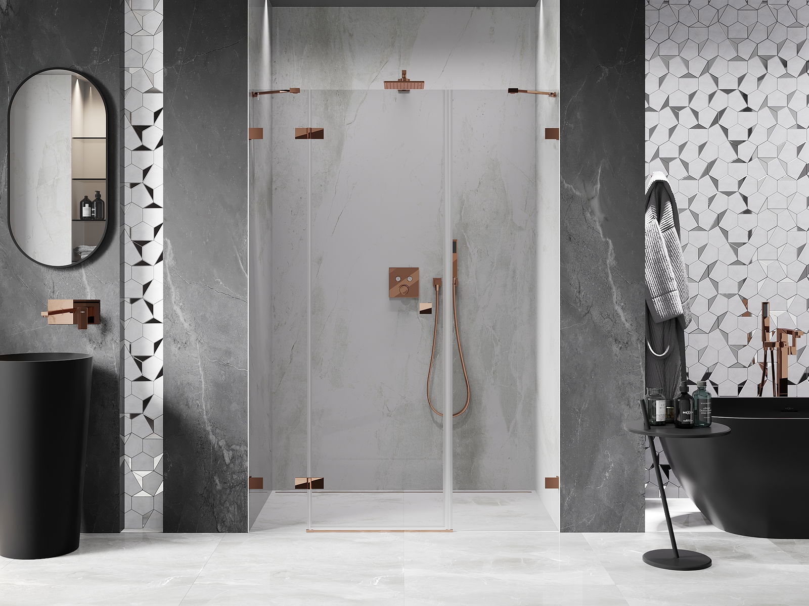 Klamry i zawiasy zostały wykonane z bardzo trwałego mosiądzu, a dodatkowo tworzą zlicowaną taflę szkła. Jest to doskonały wybór, który łączy elegancję, trwałość i nowoczesny design. Dzięki takim rozwiązaniom prysznic zyskuje na estetyce, a jednocześnie ułatwiają utrzymanie czystości.