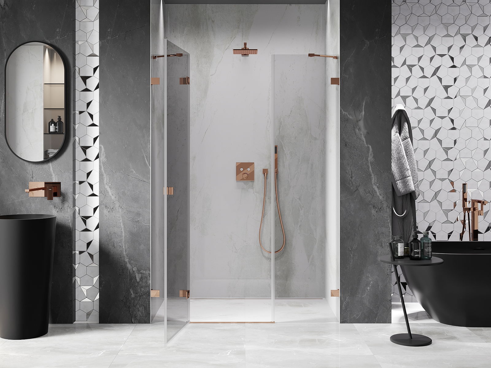Klamry i zawiasy zostały wykonane z bardzo trwałego mosiądzu, a dodatkowo tworzą zlicowaną taflę szkła. Jest to doskonały wybór, który łączy elegancję, trwałość i nowoczesny design. Dzięki takim rozwiązaniom prysznic zyskuje na estetyce, a jednocześnie ułatwiają utrzymanie czystości.