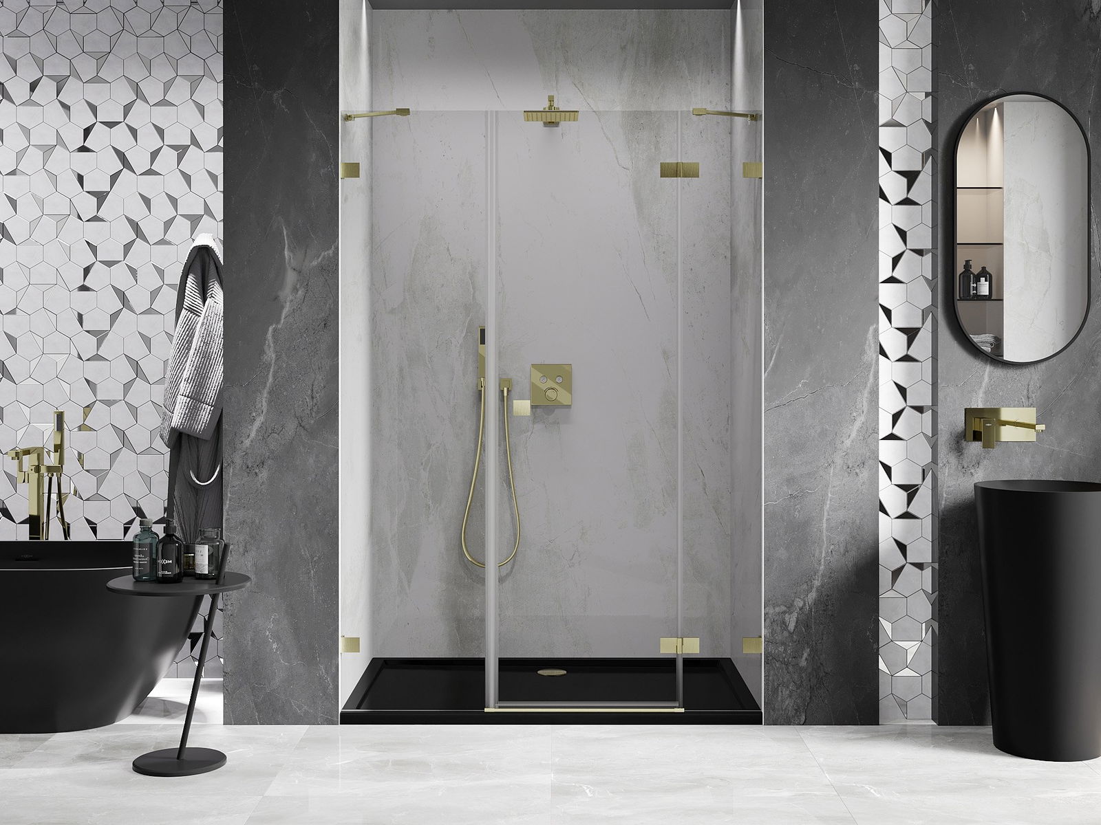 Klamry i zawiasy zostały wykonane z bardzo trwałego mosiądzu, a dodatkowo tworzą zlicowaną taflę szkła. Jest to doskonały wybór, który łączy elegancję, trwałość i nowoczesny design. Dzięki takim rozwiązaniom prysznic zyskuje na estetyce, a jednocześnie ułatwiają utrzymanie czystości.