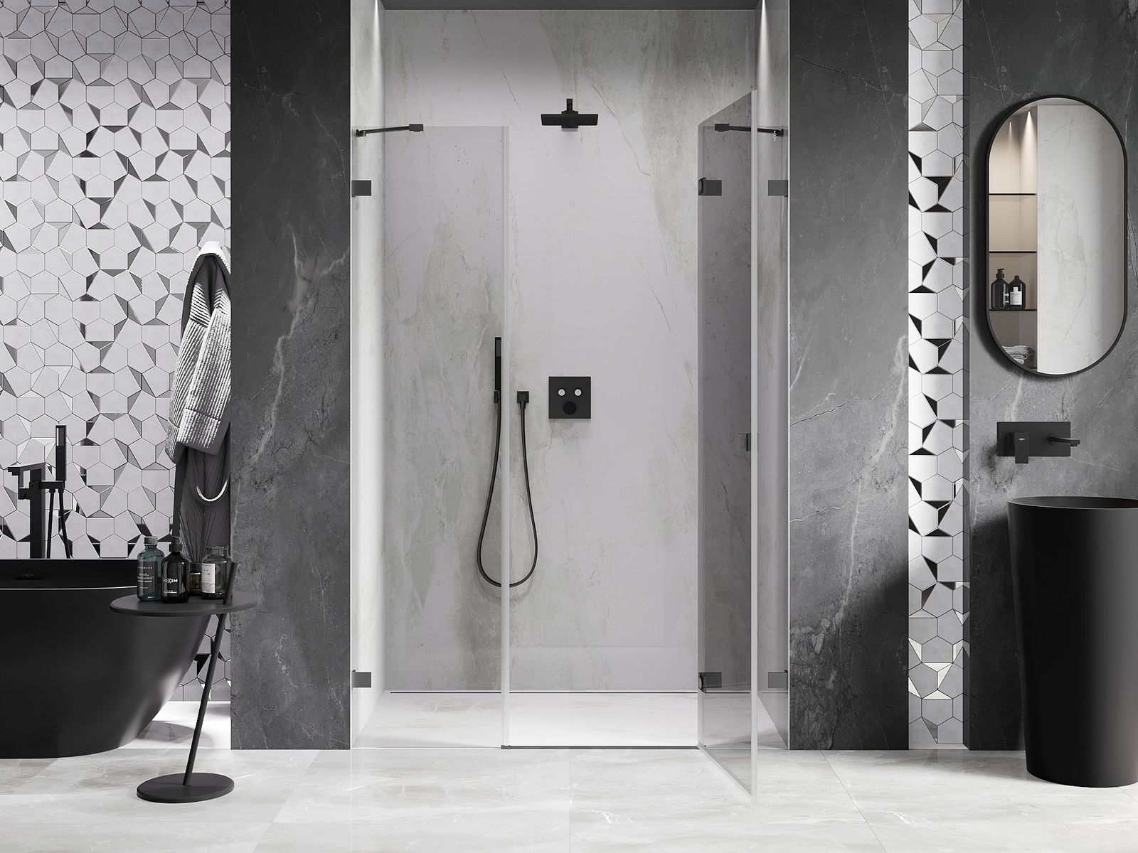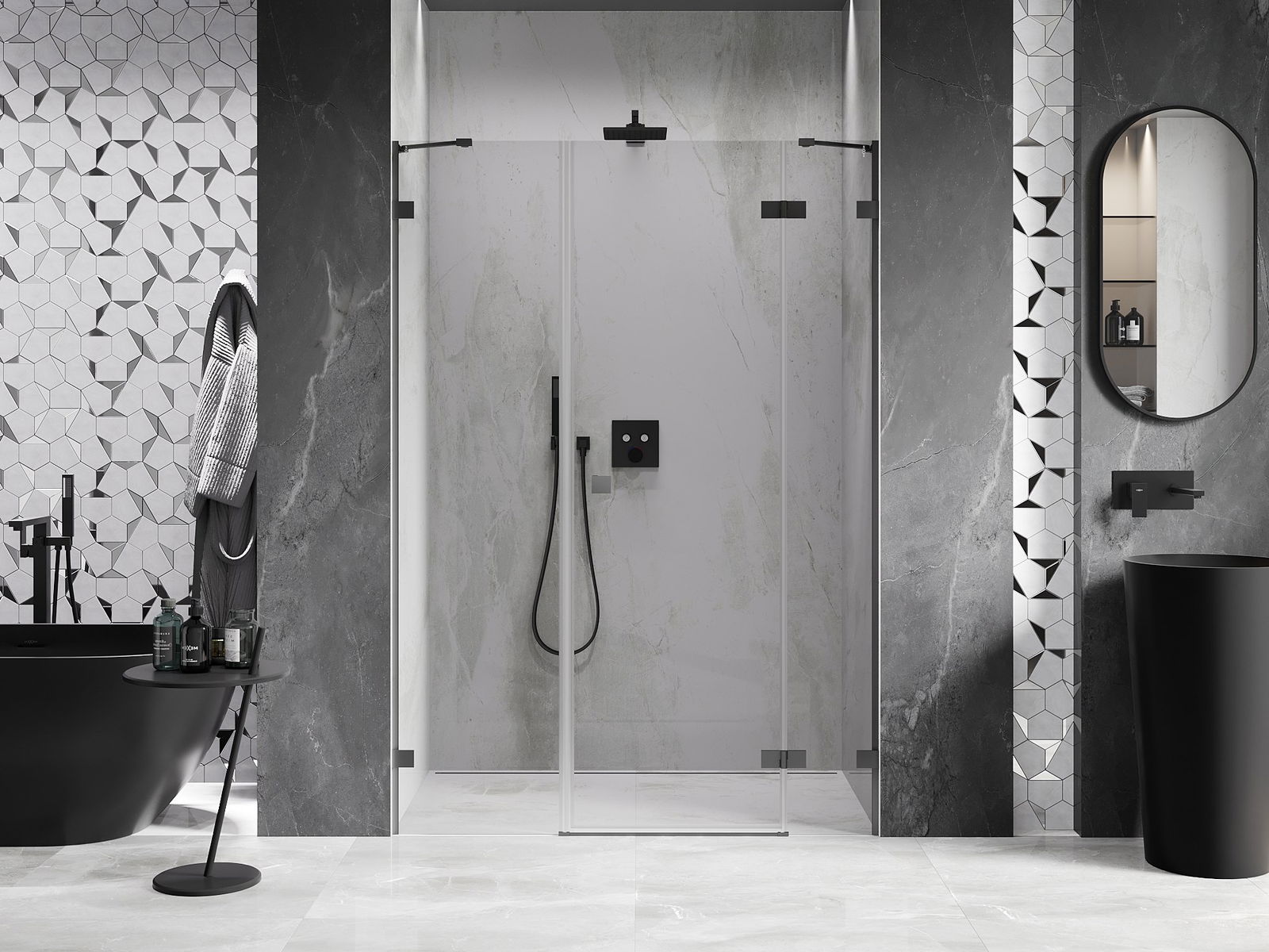 Poręczny i wygodny uchwyt został wykonany z trwałego i odpornego metalu. Modny kształt w połączeniu z wykończeniem dopasowanym do koloru profili nadaje całości nowoczesnego i stylowego wyglądu, podkreślając estetykę każdej łazienki.
