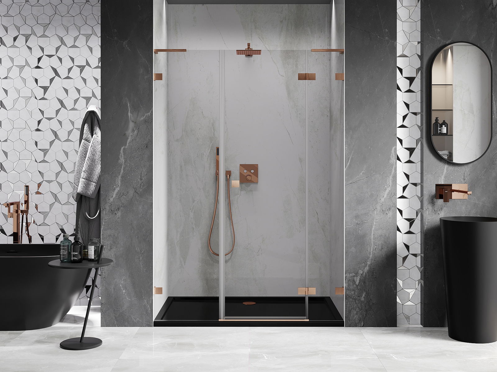 Klamry i zawiasy zostały wykonane z bardzo trwałego mosiądzu, a dodatkowo tworzą zlicowaną taflę szkła. Jest to doskonały wybór, który łączy elegancję, trwałość i nowoczesny design. Dzięki takim rozwiązaniom prysznic zyskuje na estetyce, a jednocześnie ułatwiają utrzymanie czystości.