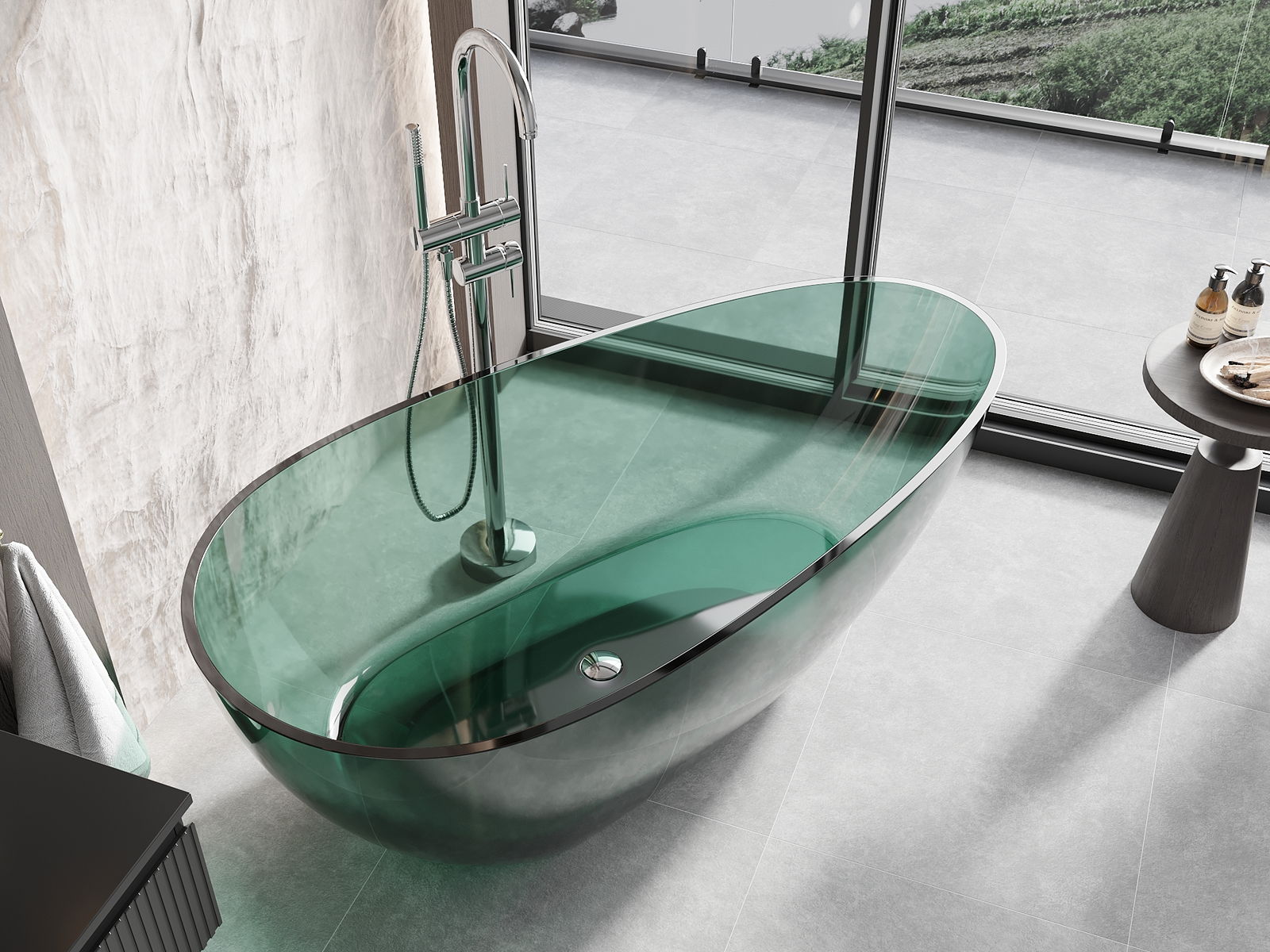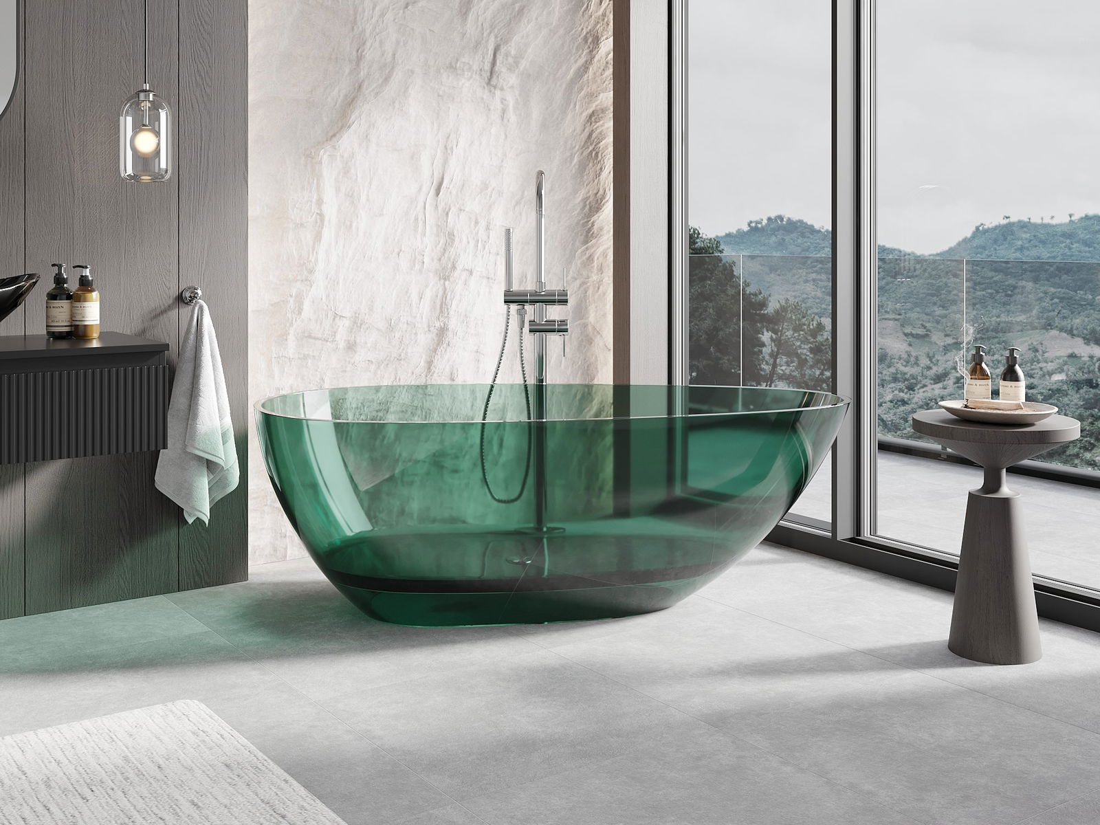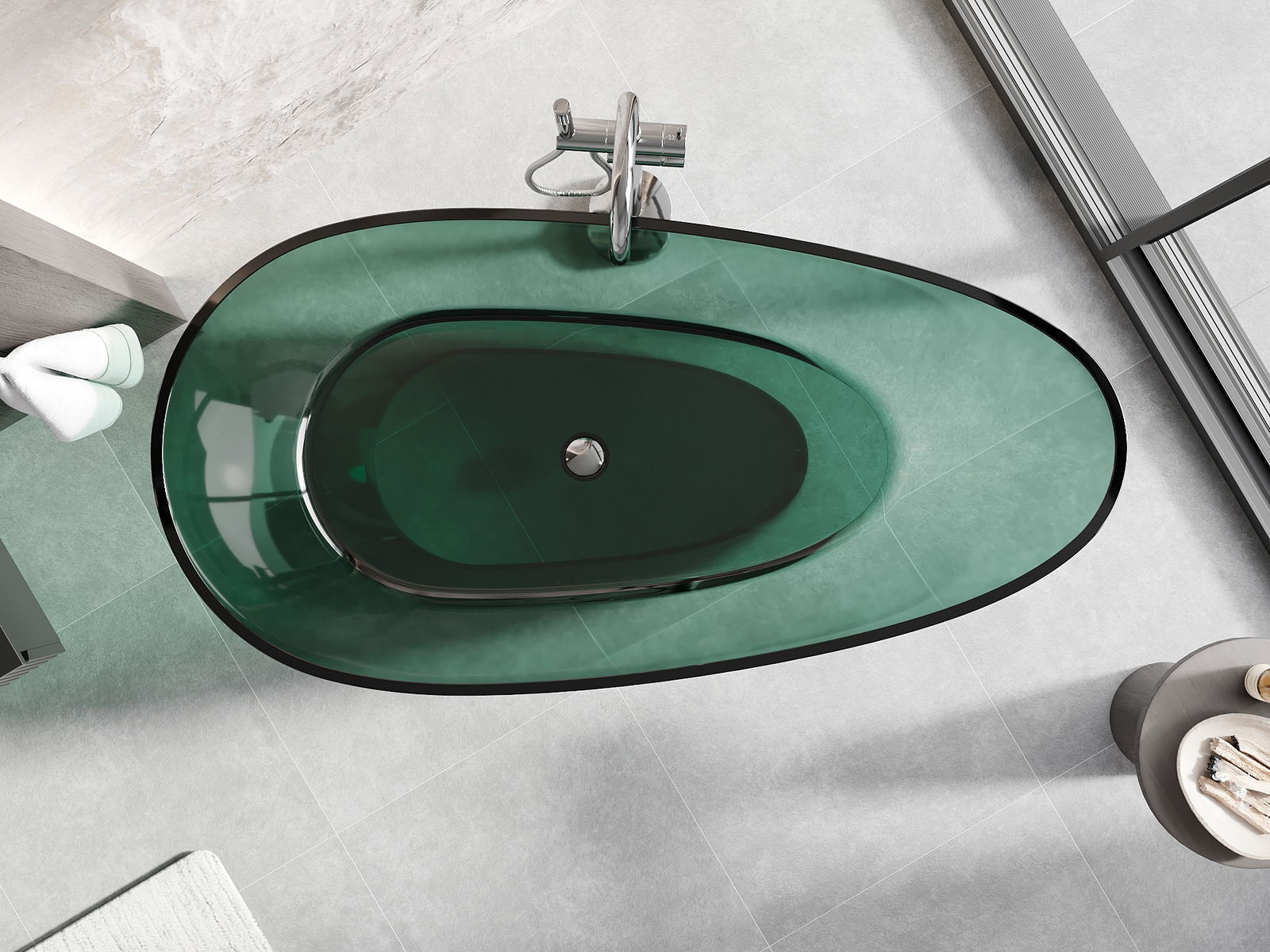 Jest to nowoczesny materiał łączący elegancki wygląd z wysoką trwałością. Jest odporny na uszkodzenia mechaniczne, łatwy w czyszczeniu i przyjemny w dotyku. Transparentna forma oraz cienki rant wanny nadaje jej lekkości i unikalnego charakteru, tworząc efektowny akcent w aranżacji łazienki.