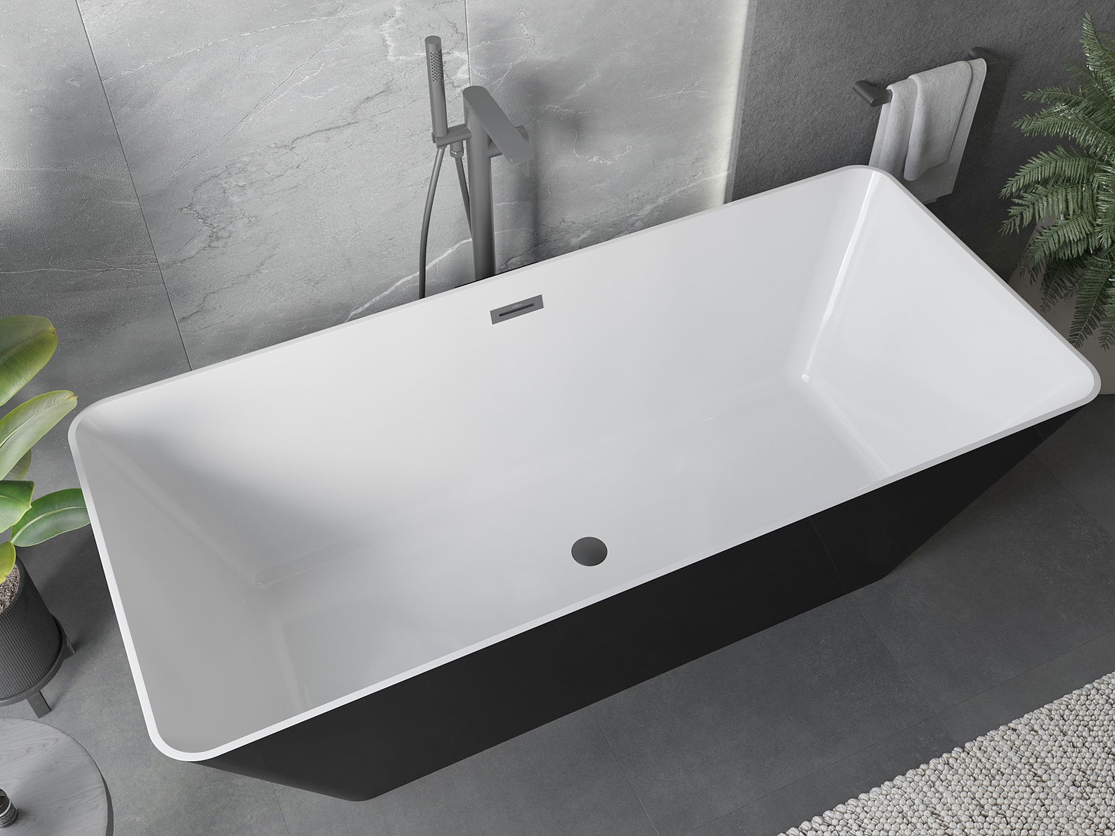 Specyfikacja produktu: Rozmiar: 170 x 75 cm Wysokość: 58 cm Głębokość: 45 cm Montaż: Wolnostojąca Materiał: Akryl sanitarny Kolor: Biały/Czarny Wykończenie: Gun metal Otwór przelewowy. Tak Otwór na baterie: Nie W komplecie syfon oraz korek klik klak Odporność na matowienie i promienie uv