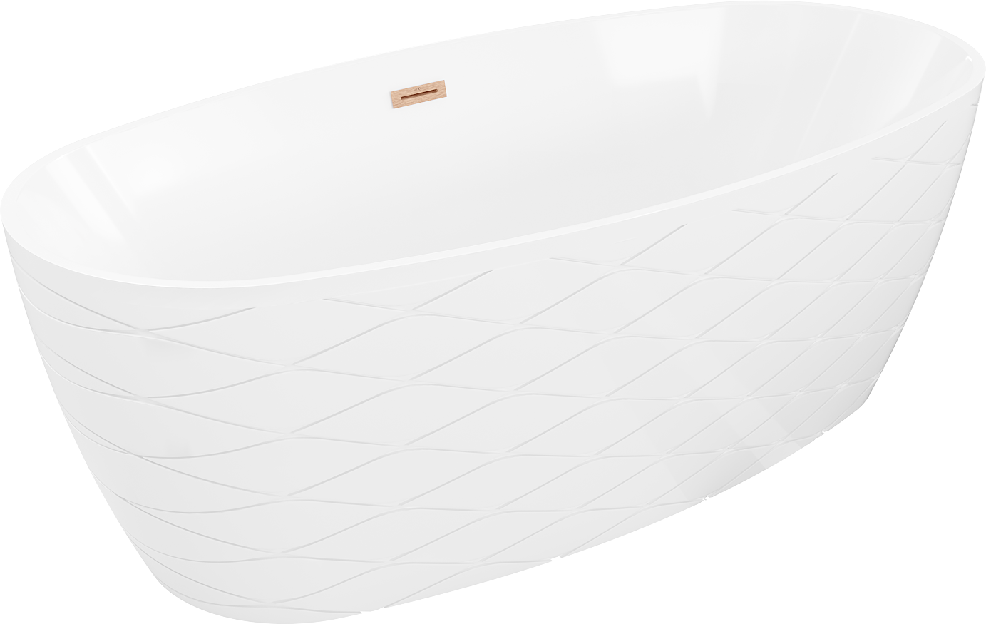 Specyfikacja produktu: Rozmiar: 170 x 80 cm Wysokość: 59 cm Głębokość: 45 cm Montaż: Wolnostojąca Materiał: Akryl sanitarny Kolor: Biały Wykończenie: Miedź szczotkowana Struktura: Wzór Otwór przelewowy. Tak Otwór na baterie: Nie W komplecie syfon oraz korek klik klak Odporność na matowienie i promienie uv