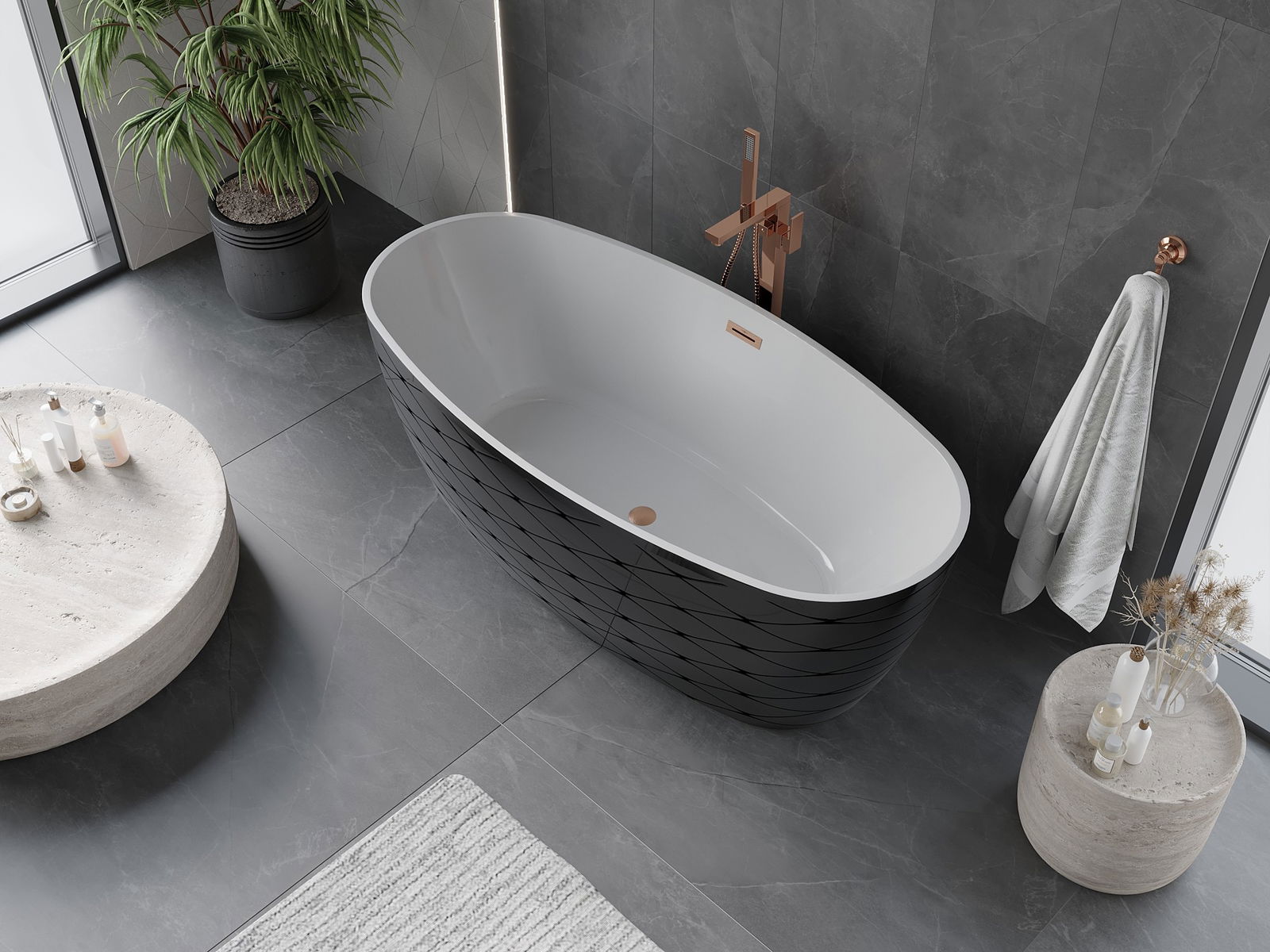 Specyfikacja produktu: Rozmiar: 170 x 80 cm Wysokość: 59 cm Głębokość: 45 cm Montaż: Wolnostojąca Materiał: Akryl sanitarny Kolor: Biały/Czarny Struktura: Wzór Wykończenie: Miedź szczotkowana Otwór przelewowy. Tak Otwór na baterie: Nie W komplecie syfon oraz korek klik klak Odporność na matowienie i promienie uv