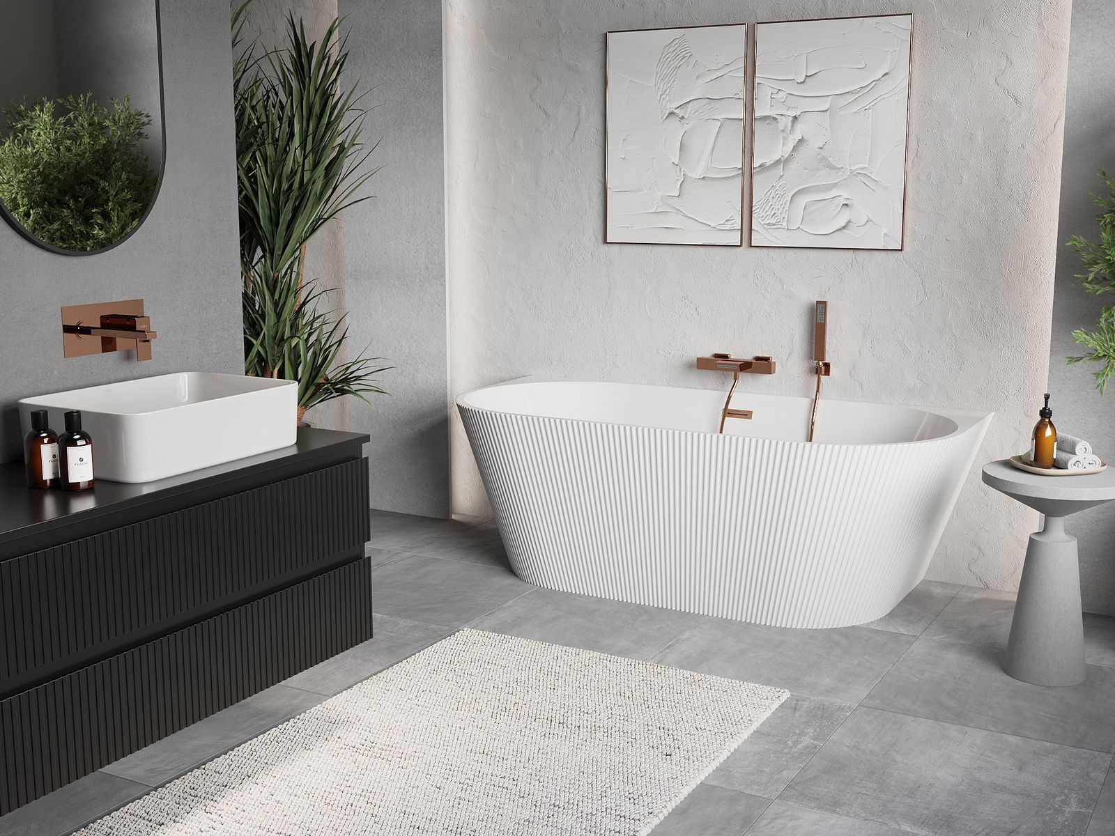 • Mexen Oris wanna wolnostojąca przyścienna ryflowana 150 x 75 cm, biała, przelew miedź szczotkowana - 52871507500-65