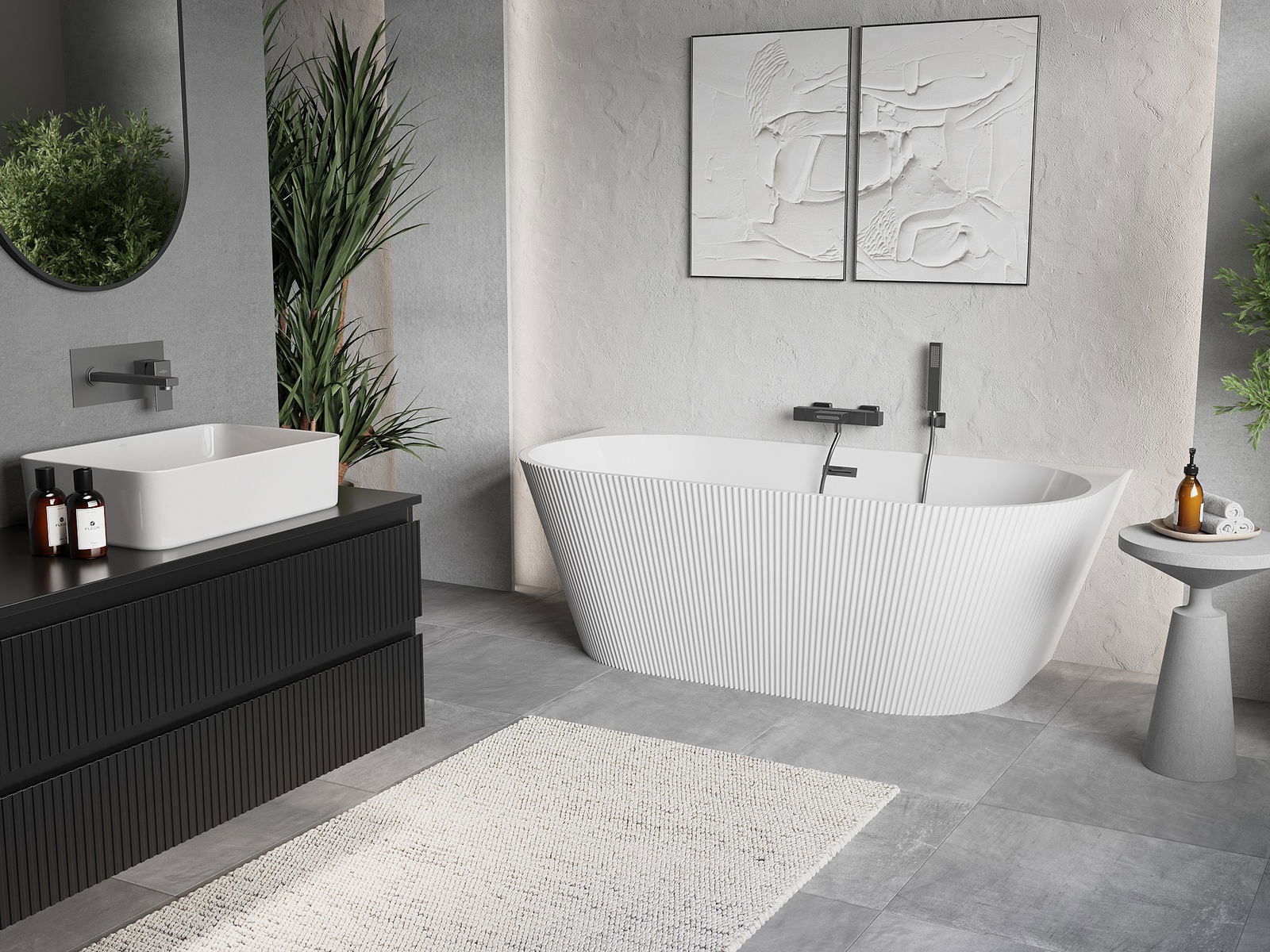 • Mexen Oris wanna wolnostojąca przyścienna ryflowana 150 x 75 cm, biała, przelew gun gray szczotkowany - 52871507500-66