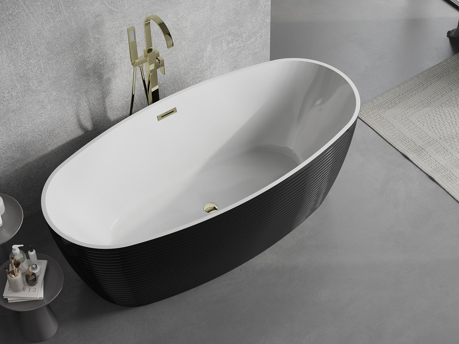 Specyfikacja produktu: Rozmiar: 170 x 80 cm Wysokość: 59 cm Głębokość: 45 cm Montaż: Wolnostojąca Materiał: Akryl sanitarny Kolor: Biały/Czarny Wykończenie: Złoty Struktura: Wzór Otwór przelewowy. Tak Otwór na baterie: Nie W komplecie syfon oraz korek klik klak Odporność na matowienie i promienie uv