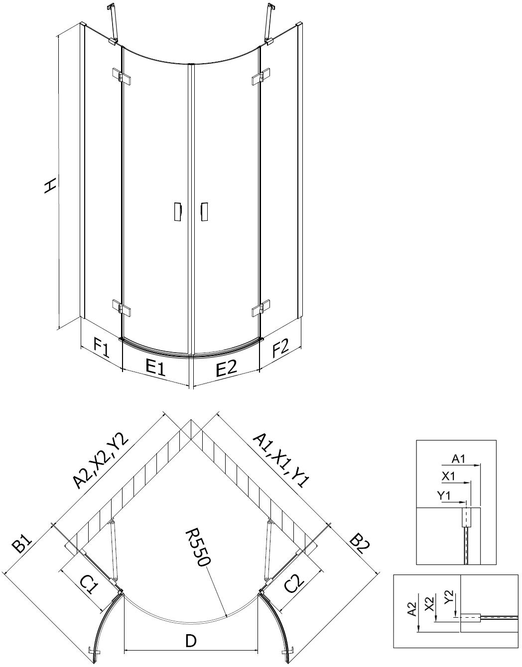 Specyfikacja produktu: Rozmiar: 90x90 cm Wysokość: 200 cm Promień zaokrąglenia R55 Strona montażu: Uniwersalna Wejście: Drzwi uchylne Kolor szkła: Transparentne Wykończenie: Chrom Profil: Aluminiowy Wspornik: Stal nierdzewna Rodzaj szkła: Hartowane Grubość szkła: 6 mm Powłoka ułatwiająca czyszczenie Możliwa regulacja szerokości Możliwość montażu na brodziku lub płytkach Mechanizm unoszenia i opuszczania drzwi Mosiężne zawiasy zlicowane z taflą szkła Listwa magnetyczna oraz uszczelki elastomerowe odprowadzające wodę Aluminiowy próg uszczelniający drzwi