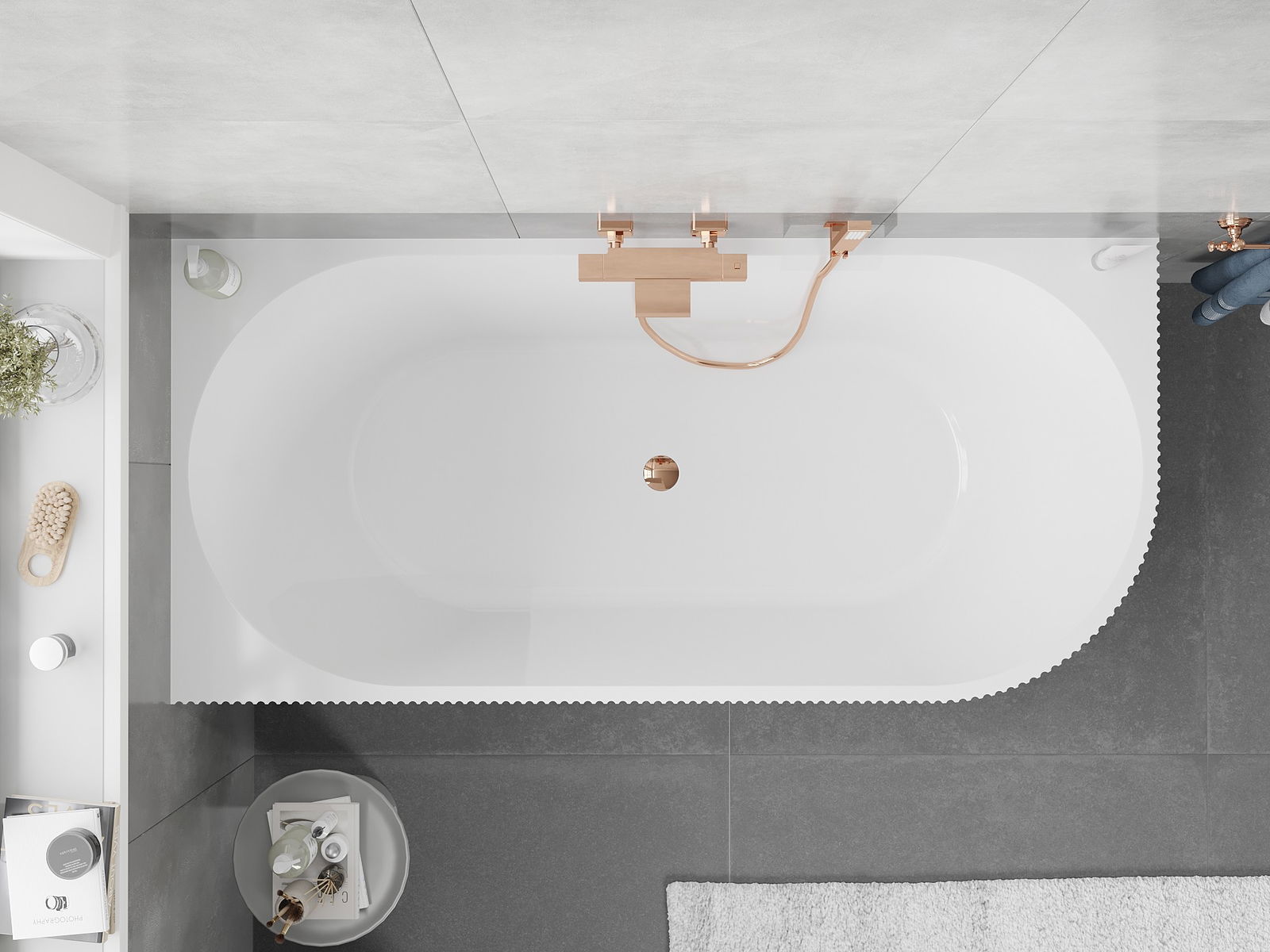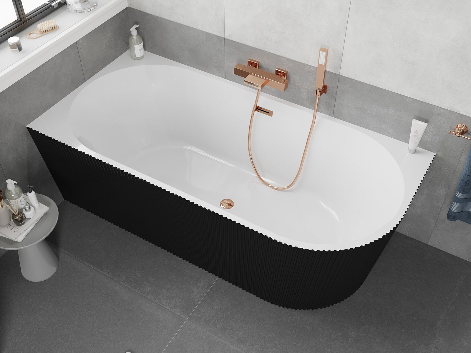 • Mexen Silo wanna wolnostojąca narożna lewa ryflowana  150 x 75 cm, biała/czarna, przelew różowe złoto - 52891507575L-60