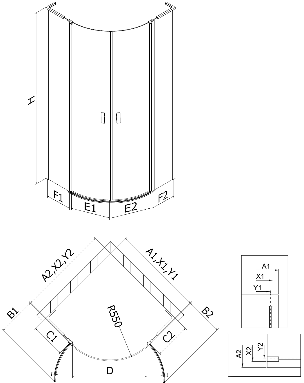 Specyfikacja produktu: Rozmiar: 80x80 cm Wysokość: 200 cm Promień zaokrąglenia R55 Strona montażu: Uniwersalna Wejście: Drzwi uchylne Kolor szkła: Czarna ramka Wykończenie: Czarny Profil: Aluminiowy Stabilizator kątowy L: Stal nierdzewna Rodzaj szkła: Hartowane Grubość szkła: 6 mm Powłoka ułatwiająca czyszczenie Możliwa regulacja szerokości Możliwość montażu na brodziku lub płytkach Mechanizm unoszenia i opuszczania drzwi Listwa magnetyczna oraz uszczelki elastomerowe odprowadzające wodę Aluminiowy próg uszczelniający drzwi