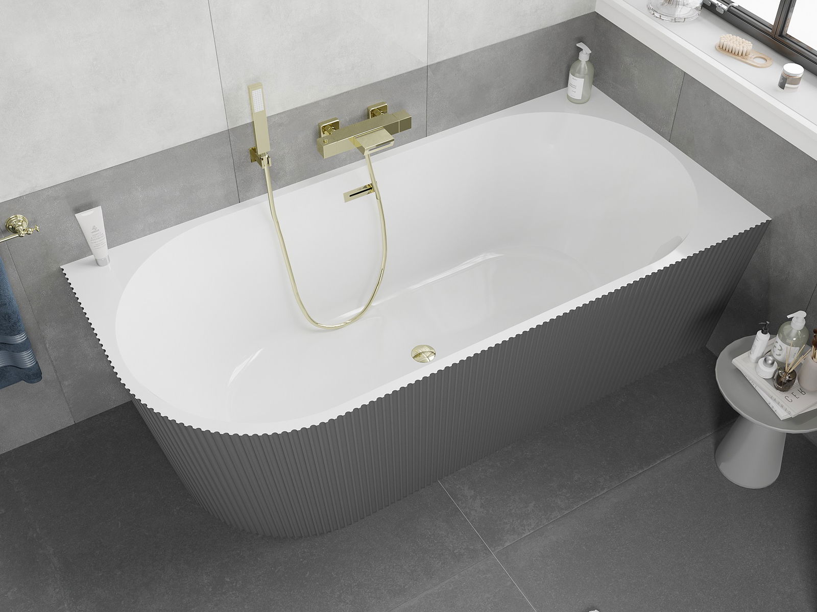 Mexen Silo wanna wolnostojąca narożna prawa ryflowana 150 x 75 cm, biała/szara, przelew złoty - 52891507562P-50