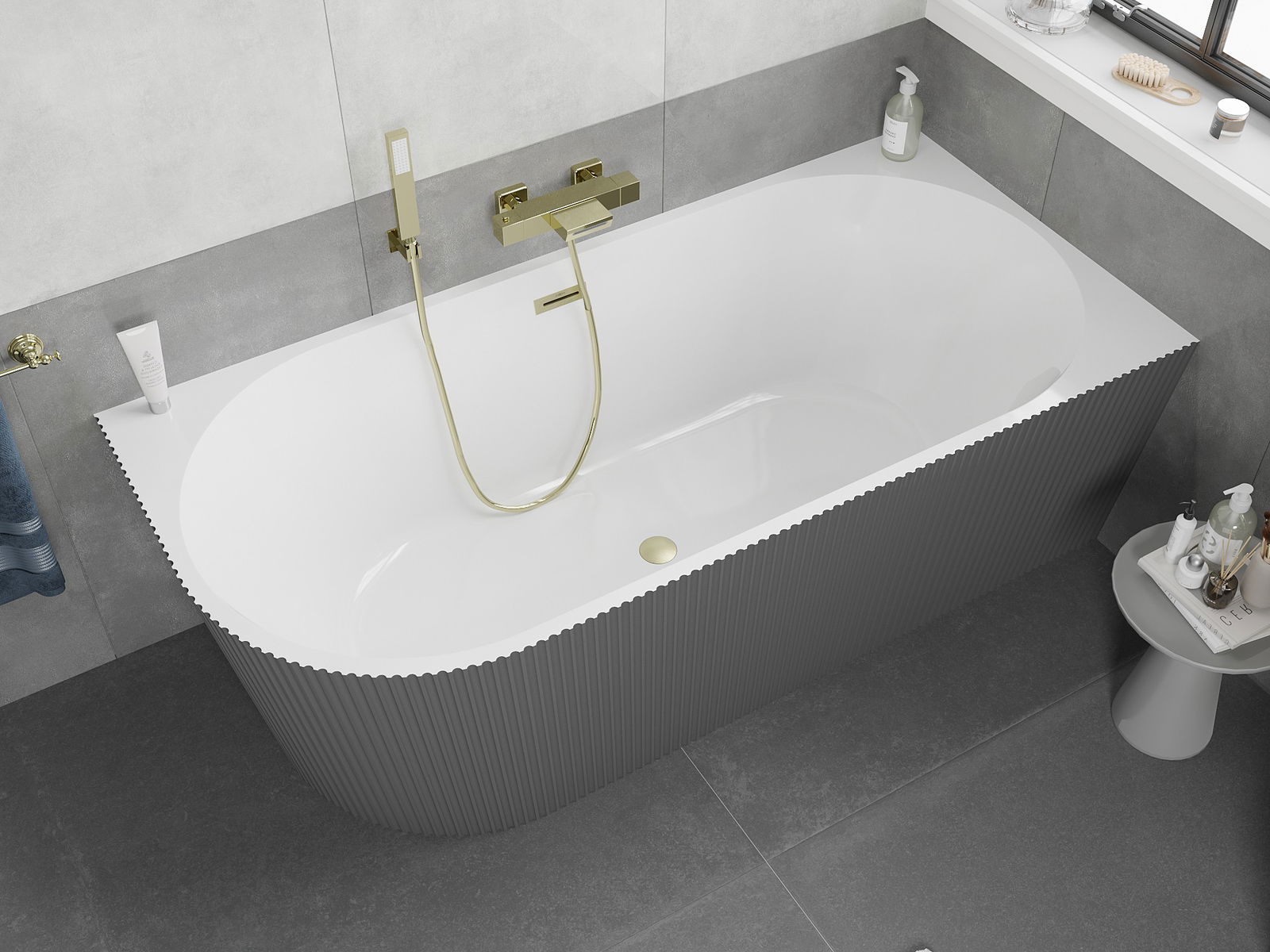 Mexen Silo wanna wolnostojąca narożna prawa ryflowana  150 x 75 cm, biała/szara, przelew złoty szczotkowany - 52891507562P-55