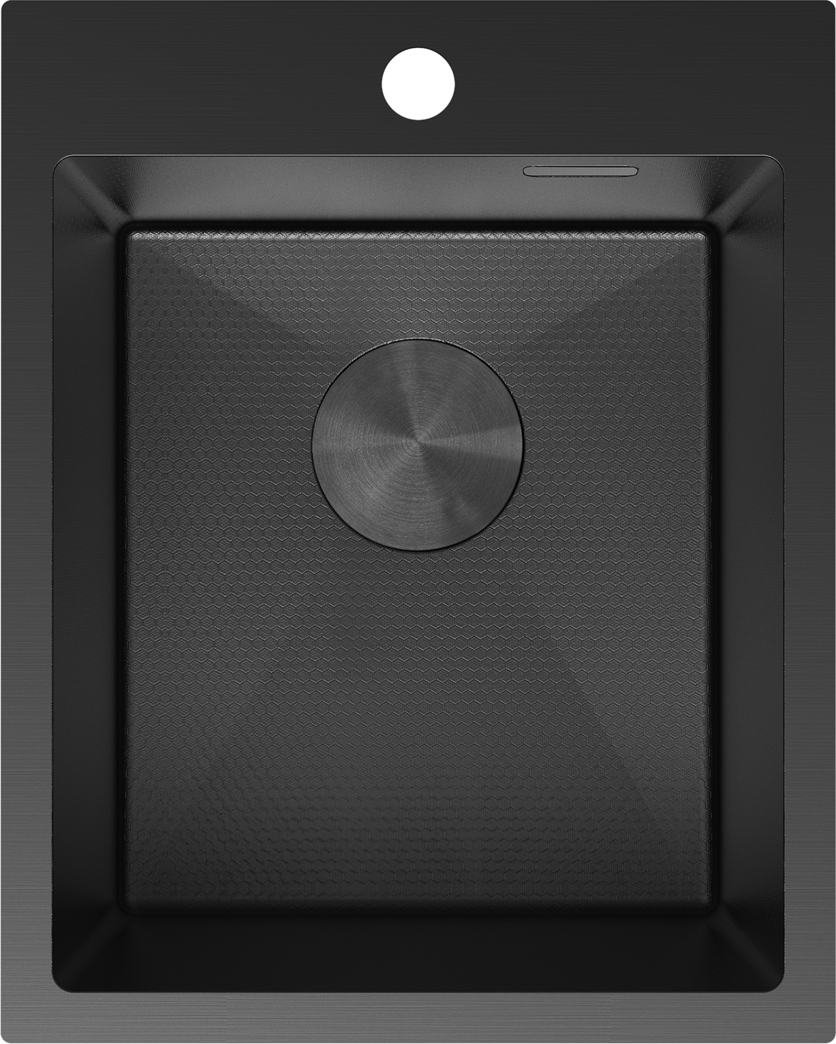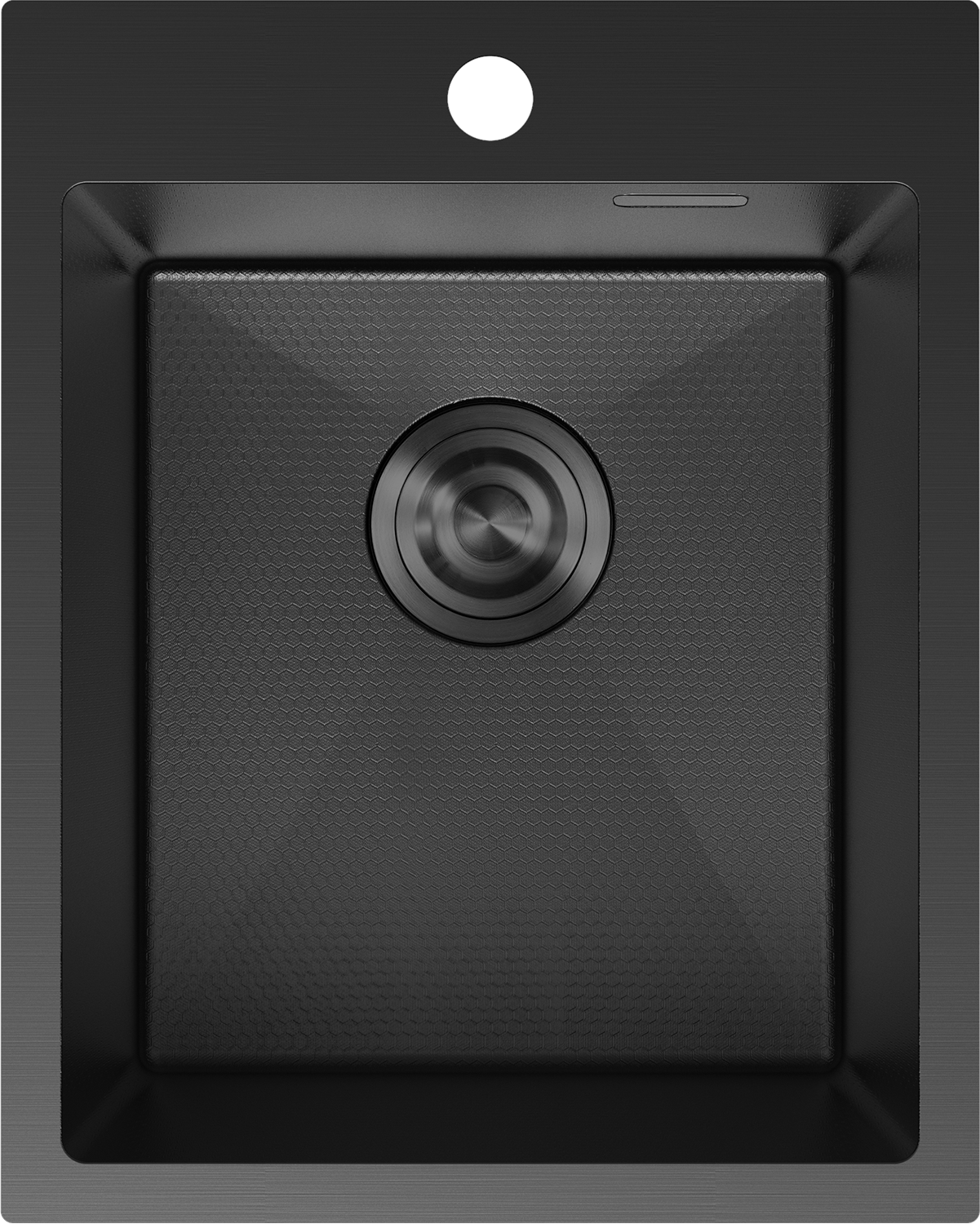 Specyfikacja produktu: Rozmiar: 400x500x200 mm Głębokość komory: 200 mm Wymiary komory: 400x350 mm Grubość stali rantu: 3 mm Grubość stali komory: 1 mm Promień zaokrąglenia narożników komory: R10 Średnica odpływu: ø92 mm Rodzaj: 1-komorowy Typ: Wpuszczany w blat Materiał: Stal nierdzewna AISI 304  Kolor: Czarny Powierzchnia: Plaster miodu Wykończenie syfonu: Czarny Otwór przelewowy: Tak Otwór na baterie: Tak Syfon manualny w komplecie z koszyczkiem na odpady i korkiem Dodatkowa maskownica na odpływ Ukryty otwór przelewowy Maty wygłuszające zlewozmywak Wytrzymałość na uderzenia, zarysowania i przebarwienia Odporność na wysoką temperaturę i szok termiczny Powierzchnia ułatwiająca czyszczenie