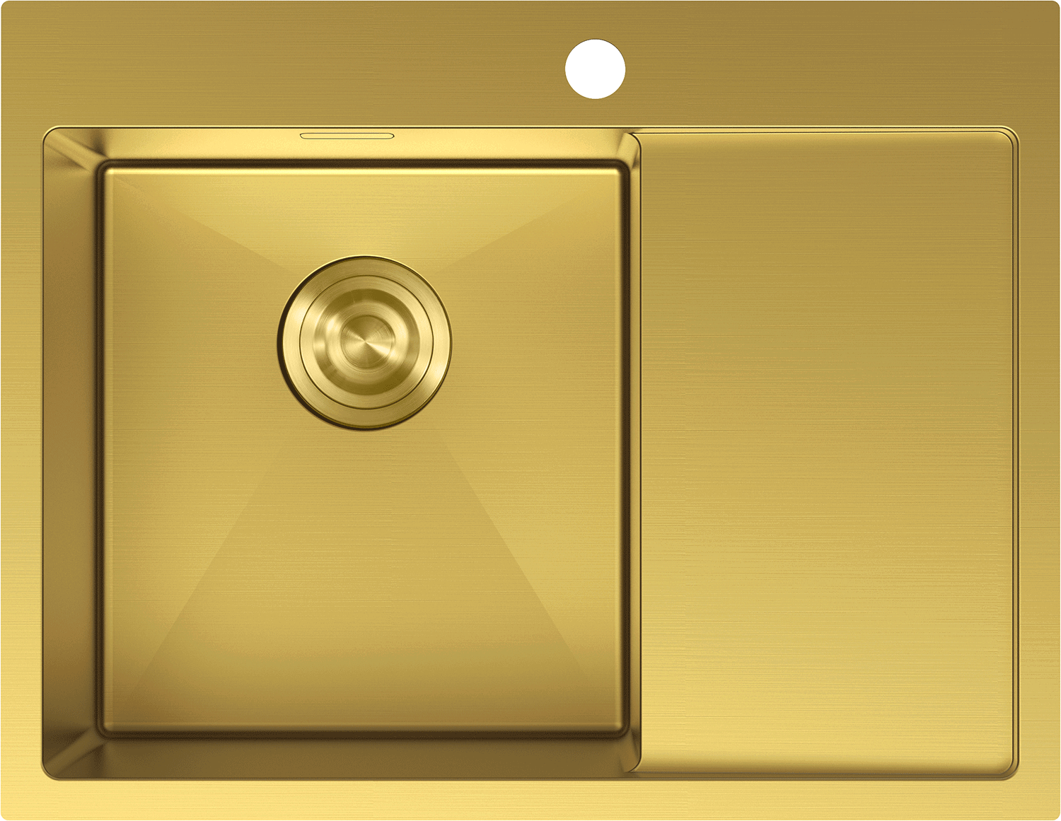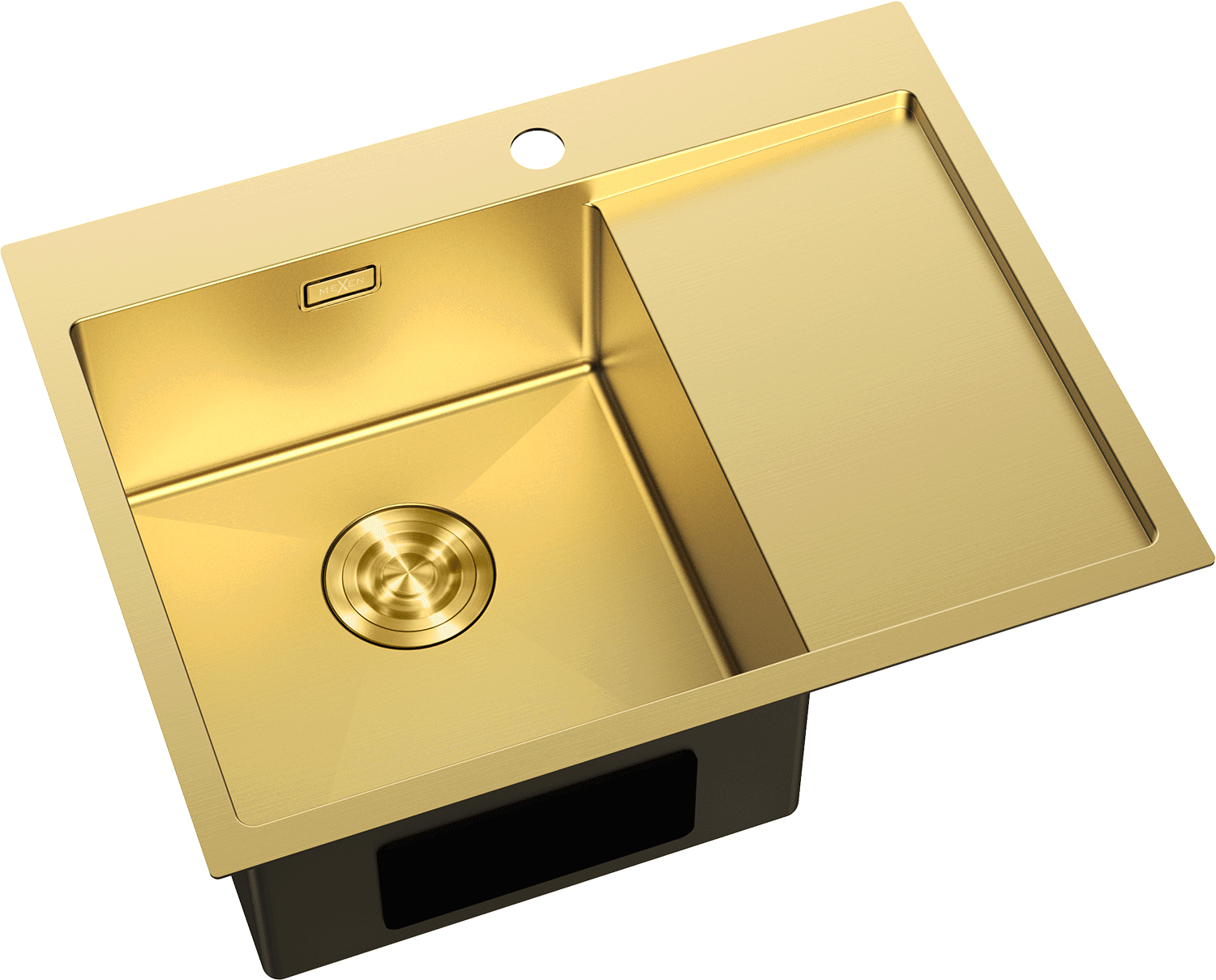 Specyfikacja produktu: Rozmiar: 620x480x200 mm Głębokość komory: 200 mm Wymiary komory: 380x350 mm Grubość stali rantu: 3 mm Grubość stali komory: 1 mm Promień zaokrąglenia narożników komory: R10 Średnica odpływu: ø92 mm Rodzaj: 1-komorowy z krótkim ociekaczem Typ: Wpuszczany w blat, Lewy Materiał: Stal nierdzewna AISI 304  Kolor: Złoty Powierzchnia: Gładka Wykończenie syfonu: Złoty Otwór przelewowy: Tak Otwór na baterie: Tak Syfon manualny w komplecie z koszyczkiem na odpady i korkiem Dodatkowa maskownica na odpływ Ukryty otwór przelewowy Maty wygłuszające zlewozmywak Wytrzymałość na uderzenia, zarysowania i przebarwienia Odporność na wysoką temperaturę i szok termiczny Powierzchnia ułatwiająca czyszczenie