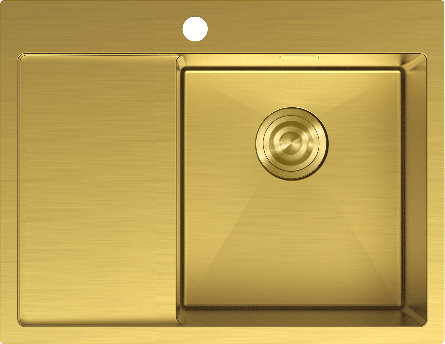 Specyfikacja produktu: Rozmiar: 620x480x200 mm Głębokość komory: 200 mm Wymiary komory: 380x350 mm Grubość stali rantu: 3 mm Grubość stali komory: 1 mm Promień zaokrąglenia narożników komory: R10 Średnica odpływu: ø92 mm Rodzaj: 1-komorowy z krótkim ociekaczem Typ: Wpuszczany w blat, Prawy Materiał: Stal nierdzewna AISI 304  Kolor: Złoty Powierzchnia: Gładka Wykończenie syfonu: Złoty Otwór przelewowy: Tak Otwór na baterie: Tak Syfon manualny w komplecie z koszyczkiem na odpady i korkiem Dodatkowa maskownica na odpływ Ukryty otwór przelewowy Maty wygłuszające zlewozmywak Wytrzymałość na uderzenia, zarysowania i przebarwienia Odporność na wysoką temperaturę i szok termiczny Powierzchnia ułatwiająca czyszczenie