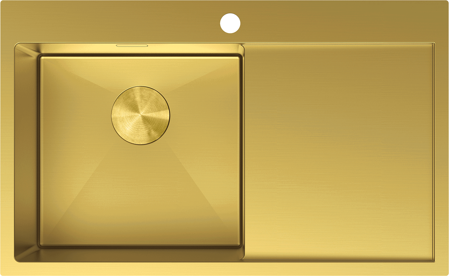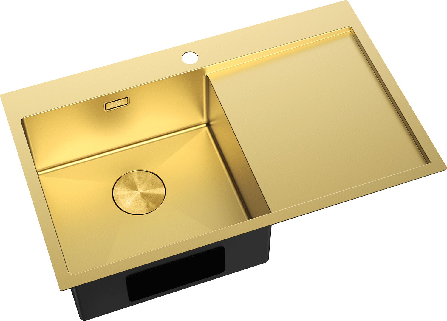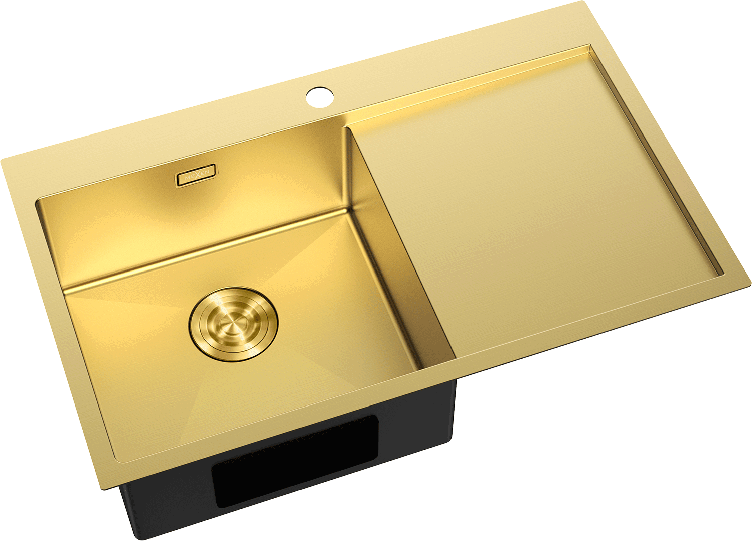 Specyfikacja produktu: Rozmiar: 780x480x200 mm Głębokość komory: 200 mm Wymiary komory: 400x380 mm Grubość stali rantu: 3 mm Grubość stali komory: 1 mm Promień zaokrąglenia narożników komory: R10 Średnica odpływu: ø92 mm Rodzaj: 1-komorowy z długim ociekaczem Typ: Wpuszczany w blat, Lewy Materiał: Stal nierdzewna AISI 304  Kolor: Złoty Powierzchnia: Gładka Wykończenie syfonu: Złoty Otwór przelewowy: Tak Otwór na baterie: Tak Syfon manualny w komplecie z koszyczkiem na odpady i korkiem Dodatkowa maskownica na odpływ Ukryty otwór przelewowy Maty wygłuszające zlewozmywak Wytrzymałość na uderzenia, zarysowania i przebarwienia Odporność na wysoką temperaturę i szok termiczny Powierzchnia ułatwiająca czyszczenie