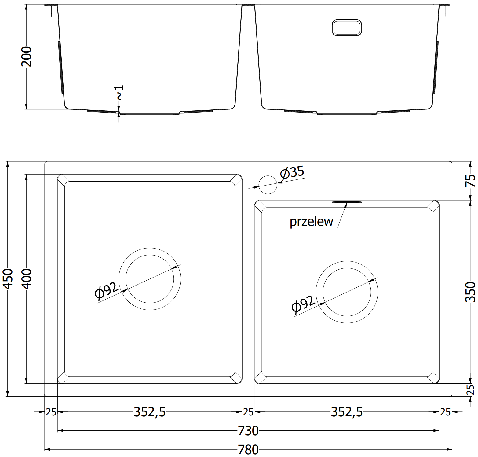 Zlew posiada ukryty otwór przelewowy, który chroni przed przelaniem się wody, zachowując jednocześnie elegancki wygląd. Dyskretnie wkomponowany w ściankę zlewu, nie zaburza jego estetyki. To praktyczne i stylowe rozwiązanie, łączące bezpieczeństwo z nowoczesnym designem.