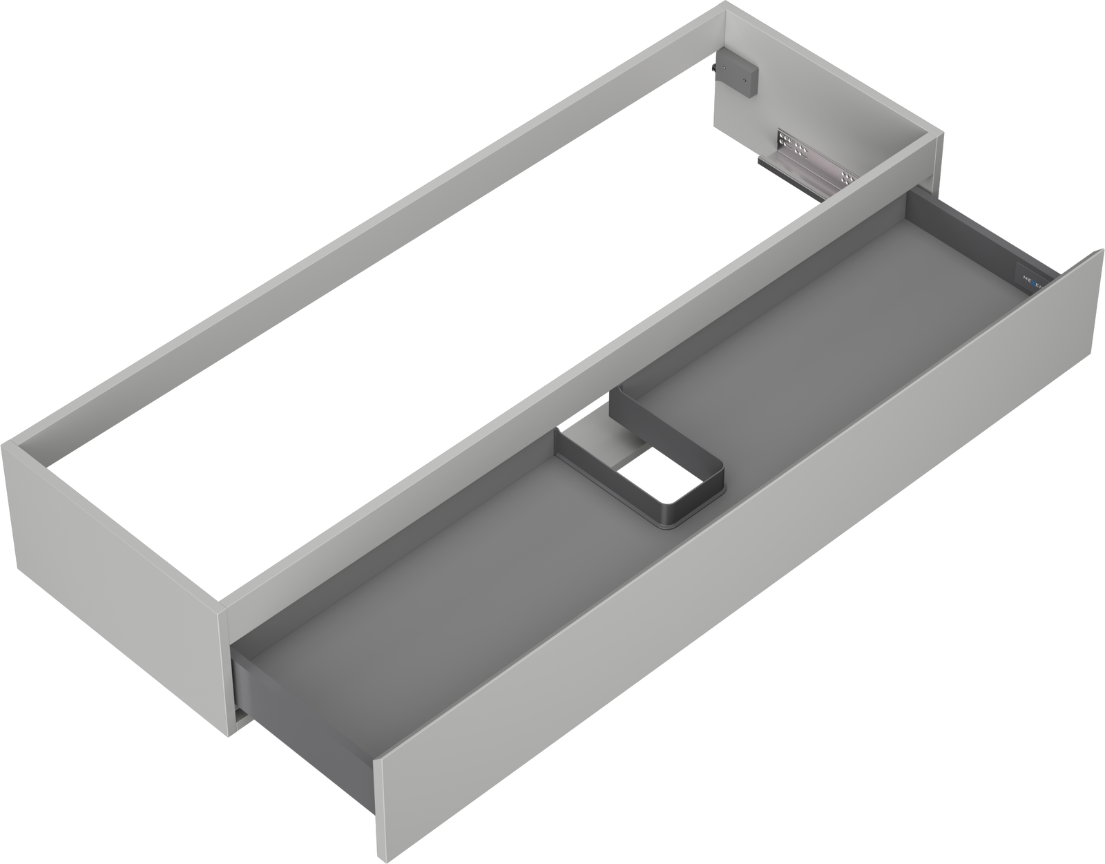Wycięcie w szufladzie jest zaprojektowane w taki sposób, aby pomieścić syfon, który jest niezbędny w instalacjach umywalkowych. Dzięki temu mebel może być zamontowany w pełni funkcjonalnie, bez konieczności rezygnowania z przestrzeni w szufladzie na rzecz instalacji.