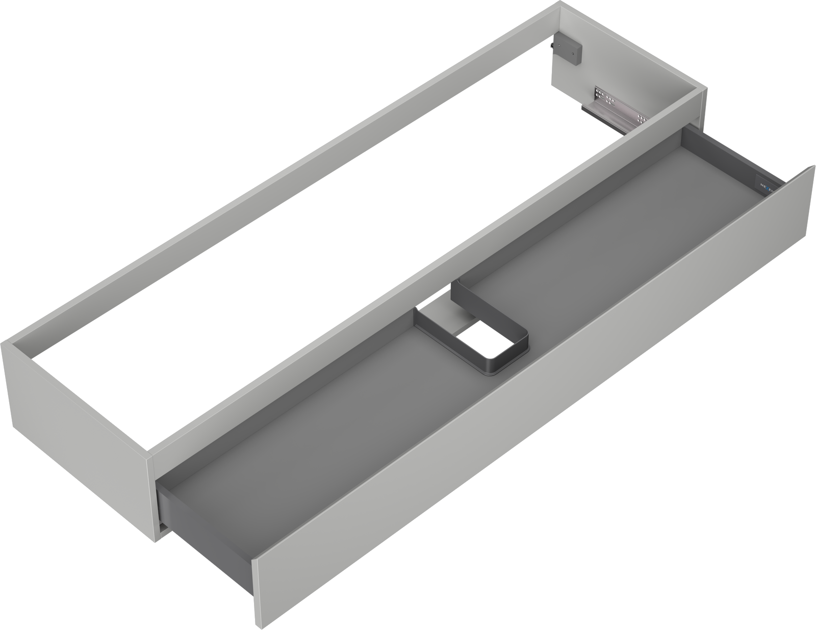 Wycięcie w szufladzie jest zaprojektowane w taki sposób, aby pomieścić syfon, który jest niezbędny w instalacjach umywalkowych. Dzięki temu mebel może być zamontowany w pełni funkcjonalnie, bez konieczności rezygnowania z przestrzeni w szufladzie na rzecz instalacji.