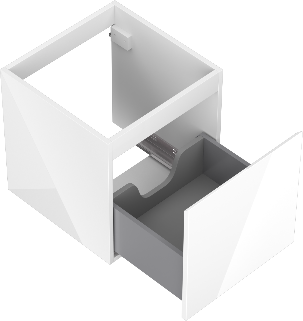 Wycięcie w szufladzie jest zaprojektowane w taki sposób, aby pomieścić syfon, który jest niezbędny w instalacjach umywalkowych. Dzięki temu mebel może być zamontowany w pełni funkcjonalnie, bez konieczności rezygnowania z przestrzeni w szufladzie na rzecz instalacji.