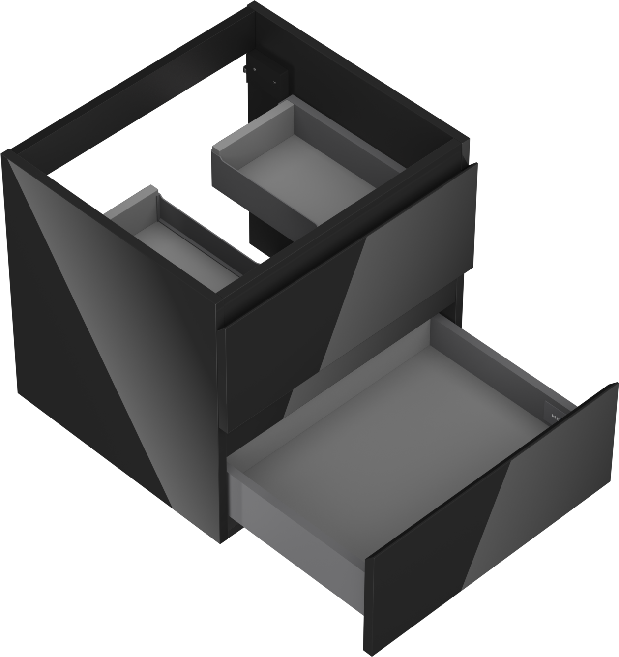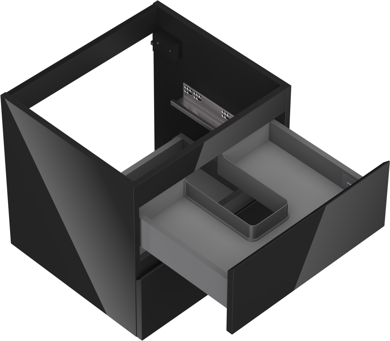 Wycięcie w szufladzie jest zaprojektowane w taki sposób, aby pomieścić syfon, który jest niezbędny w instalacjach umywalkowych. Dzięki temu mebel może być zamontowany w pełni funkcjonalnie, bez konieczności rezygnowania z przestrzeni w szufladzie na rzecz instalacji.