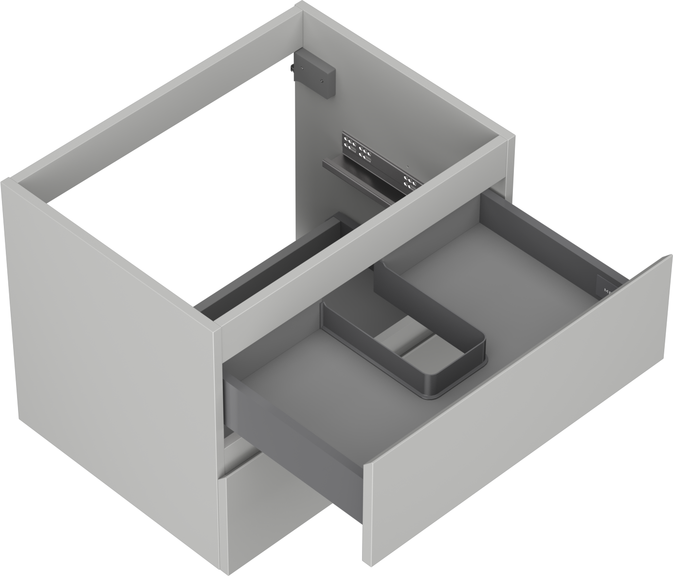 Wycięcie w szufladzie jest zaprojektowane w taki sposób, aby pomieścić syfon, który jest niezbędny w instalacjach umywalkowych. Dzięki temu mebel może być zamontowany w pełni funkcjonalnie, bez konieczności rezygnowania z przestrzeni w szufladzie na rzecz instalacji.