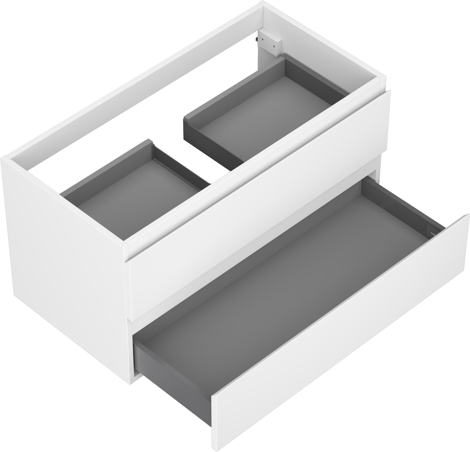 Wycięcie w szufladzie jest zaprojektowane w taki sposób, aby pomieścić syfon, który jest niezbędny w instalacjach umywalkowych. Dzięki temu mebel może być zamontowany w pełni funkcjonalnie, bez konieczności rezygnowania z przestrzeni w szufladzie na rzecz instalacji.