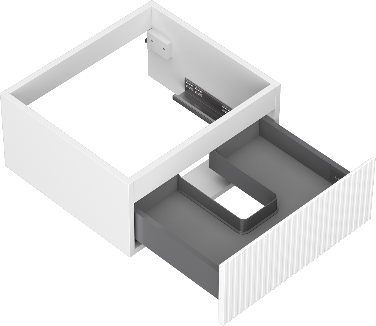 Wycięcie w szufladzie jest zaprojektowane w taki sposób, aby pomieścić syfon, który jest niezbędny w instalacjach umywalkowych. Dzięki temu mebel może być zamontowany w pełni funkcjonalnie, bez konieczności rezygnowania z przestrzeni w szufladzie na rzecz instalacji.