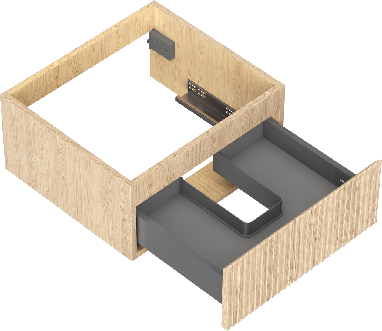Wycięcie w szufladzie jest zaprojektowane w taki sposób, aby pomieścić syfon, który jest niezbędny w instalacjach umywalkowych. Dzięki temu mebel może być zamontowany w pełni funkcjonalnie, bez konieczności rezygnowania z przestrzeni w szufladzie na rzecz instalacji.