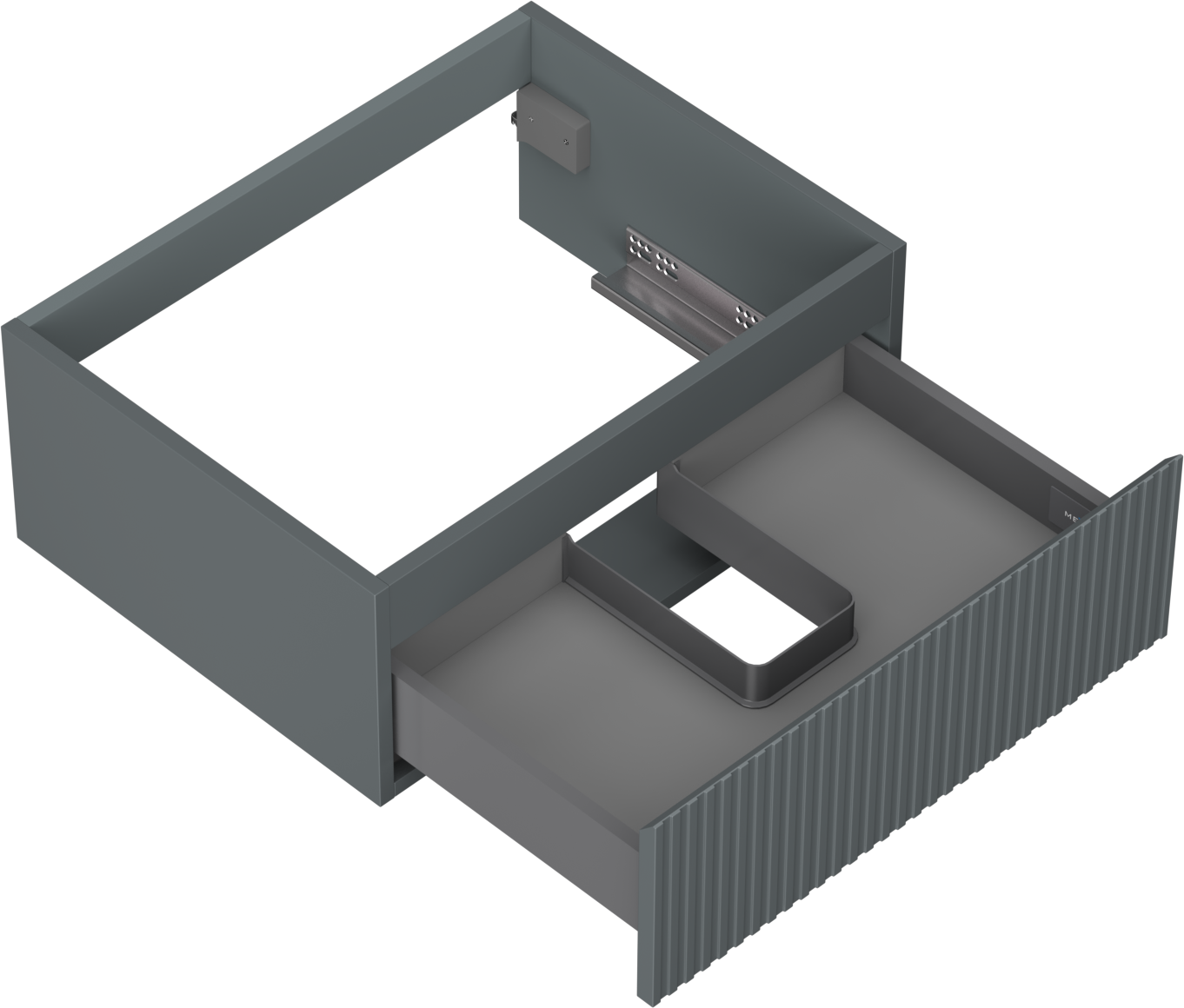 Wycięcie w szufladzie jest zaprojektowane w taki sposób, aby pomieścić syfon, który jest niezbędny w instalacjach umywalkowych. Dzięki temu mebel może być zamontowany w pełni funkcjonalnie, bez konieczności rezygnowania z przestrzeni w szufladzie na rzecz instalacji.