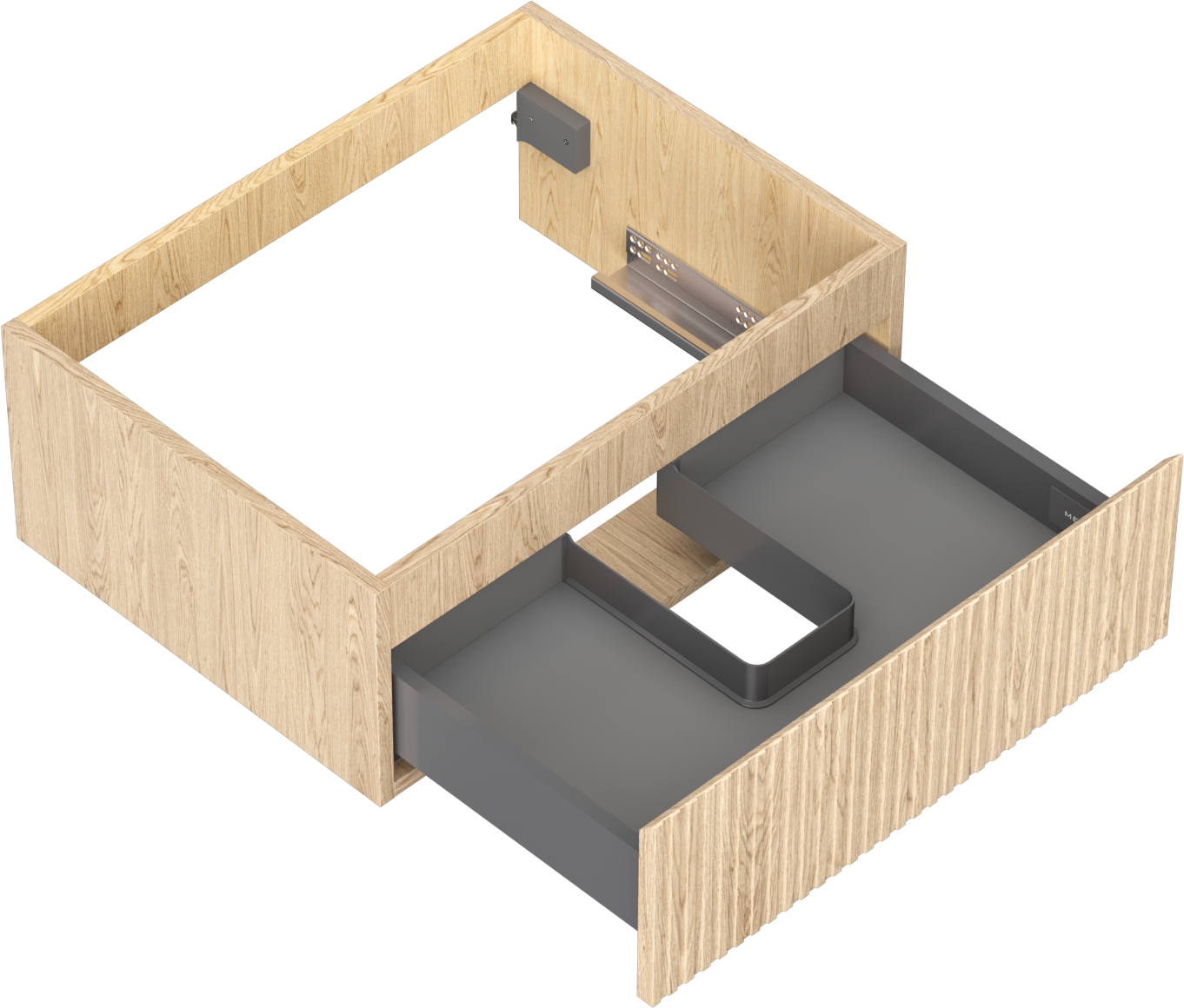 Wycięcie w szufladzie jest zaprojektowane w taki sposób, aby pomieścić syfon, który jest niezbędny w instalacjach umywalkowych. Dzięki temu mebel może być zamontowany w pełni funkcjonalnie, bez konieczności rezygnowania z przestrzeni w szufladzie na rzecz instalacji.