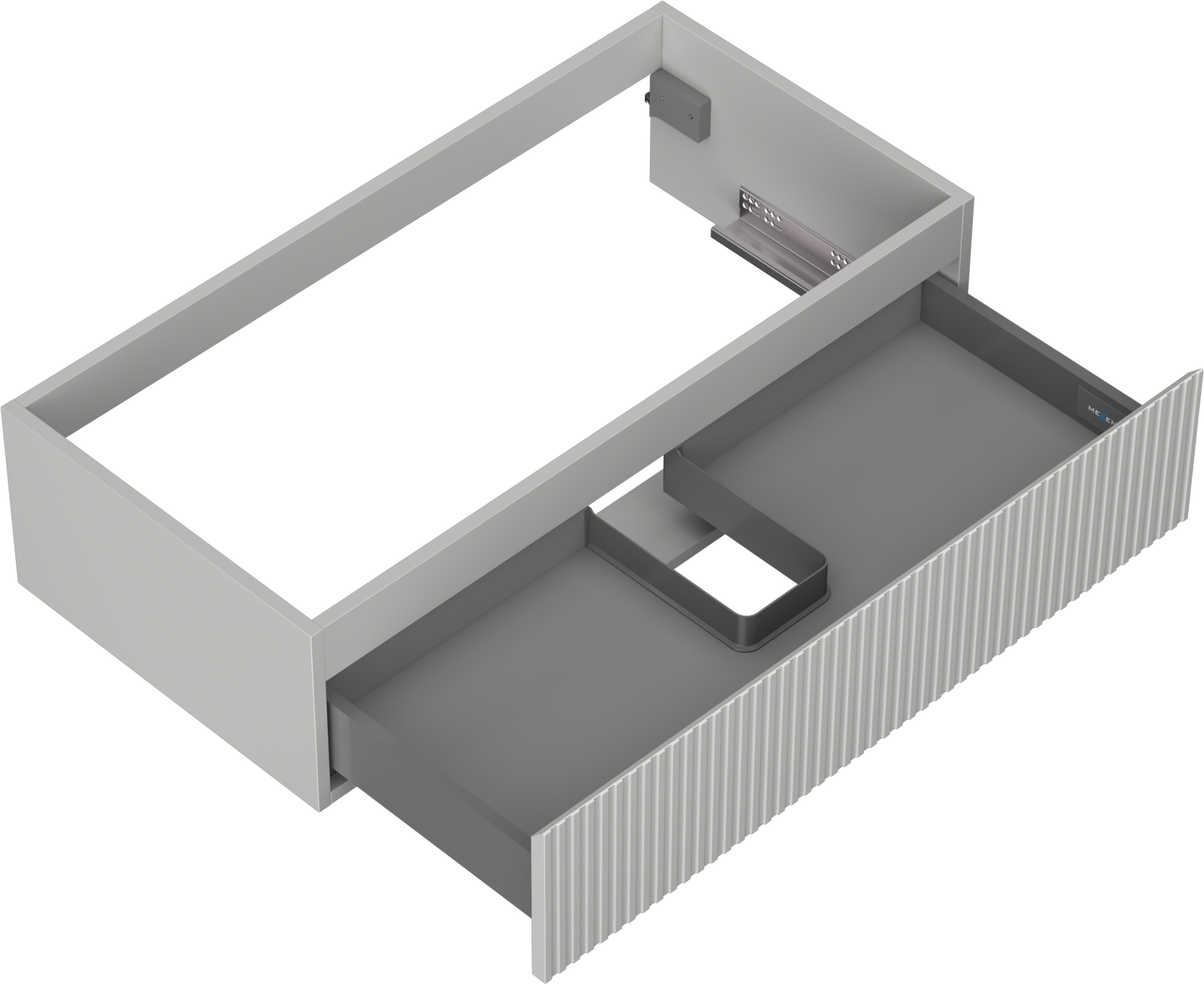 Wycięcie w szufladzie jest zaprojektowane w taki sposób, aby pomieścić syfon, który jest niezbędny w instalacjach umywalkowych. Dzięki temu mebel może być zamontowany w pełni funkcjonalnie, bez konieczności rezygnowania z przestrzeni w szufladzie na rzecz instalacji.