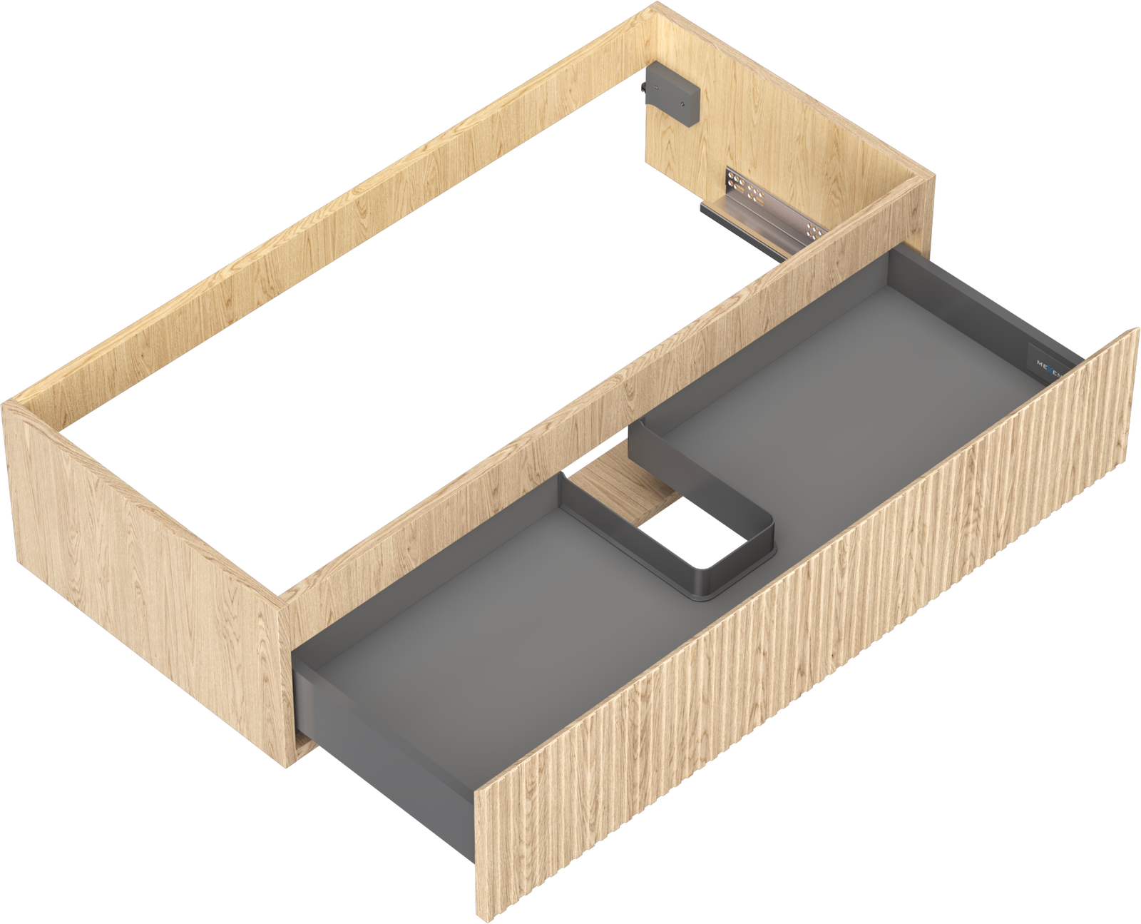 Wycięcie w szufladzie jest zaprojektowane w taki sposób, aby pomieścić syfon, który jest niezbędny w instalacjach umywalkowych. Dzięki temu mebel może być zamontowany w pełni funkcjonalnie, bez konieczności rezygnowania z przestrzeni w szufladzie na rzecz instalacji.