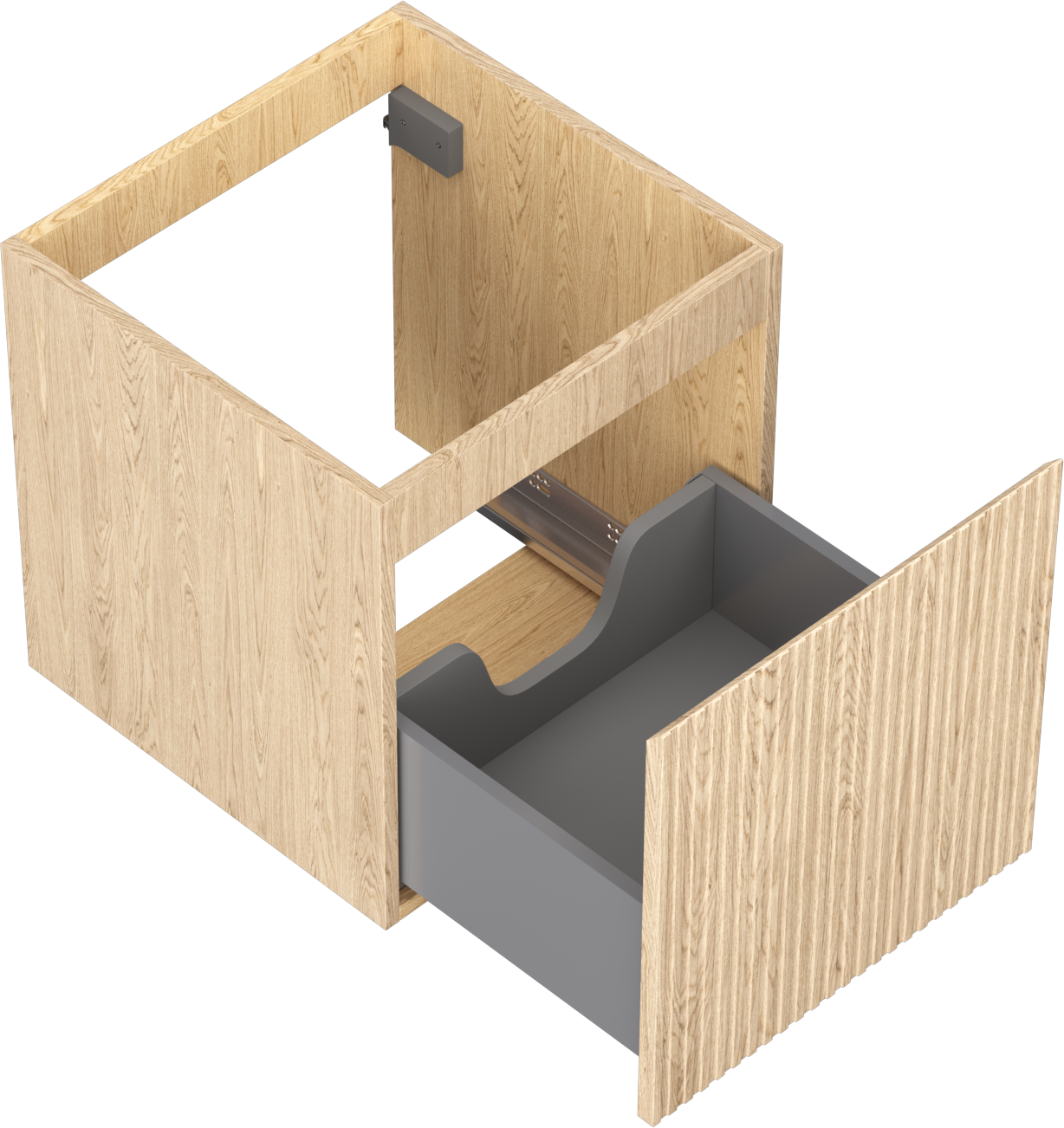 Wycięcie w szufladzie jest zaprojektowane w taki sposób, aby pomieścić syfon, który jest niezbędny w instalacjach umywalkowych. Dzięki temu mebel może być zamontowany w pełni funkcjonalnie, bez konieczności rezygnowania z przestrzeni w szufladzie na rzecz instalacji.
