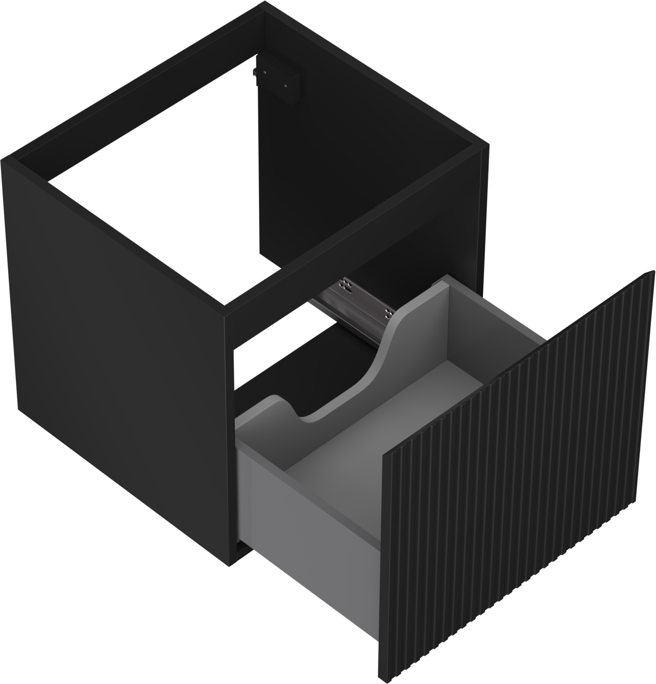 Specyfikacja produktu: Szerokość: 50 cm Wysokość: 47 cm Głębokość: 46 cm Kolor korpus: Czarny mat Materiał korpus: Płyta lakierowana Kolor front: Czarny mat Materiał front: Płyta MDF lakierowana Struktura frontu: Ryflowana Ilość szuflad: 1 Przestronna szuflada z funkcją cichego domyku Pełny wysuw ułatwiający dostęp do zawartości szuflad Powierzchnia odporna na promienie UV Do kompletowania z blatem lub umywalką Otis, Vela Produkt zmontowany