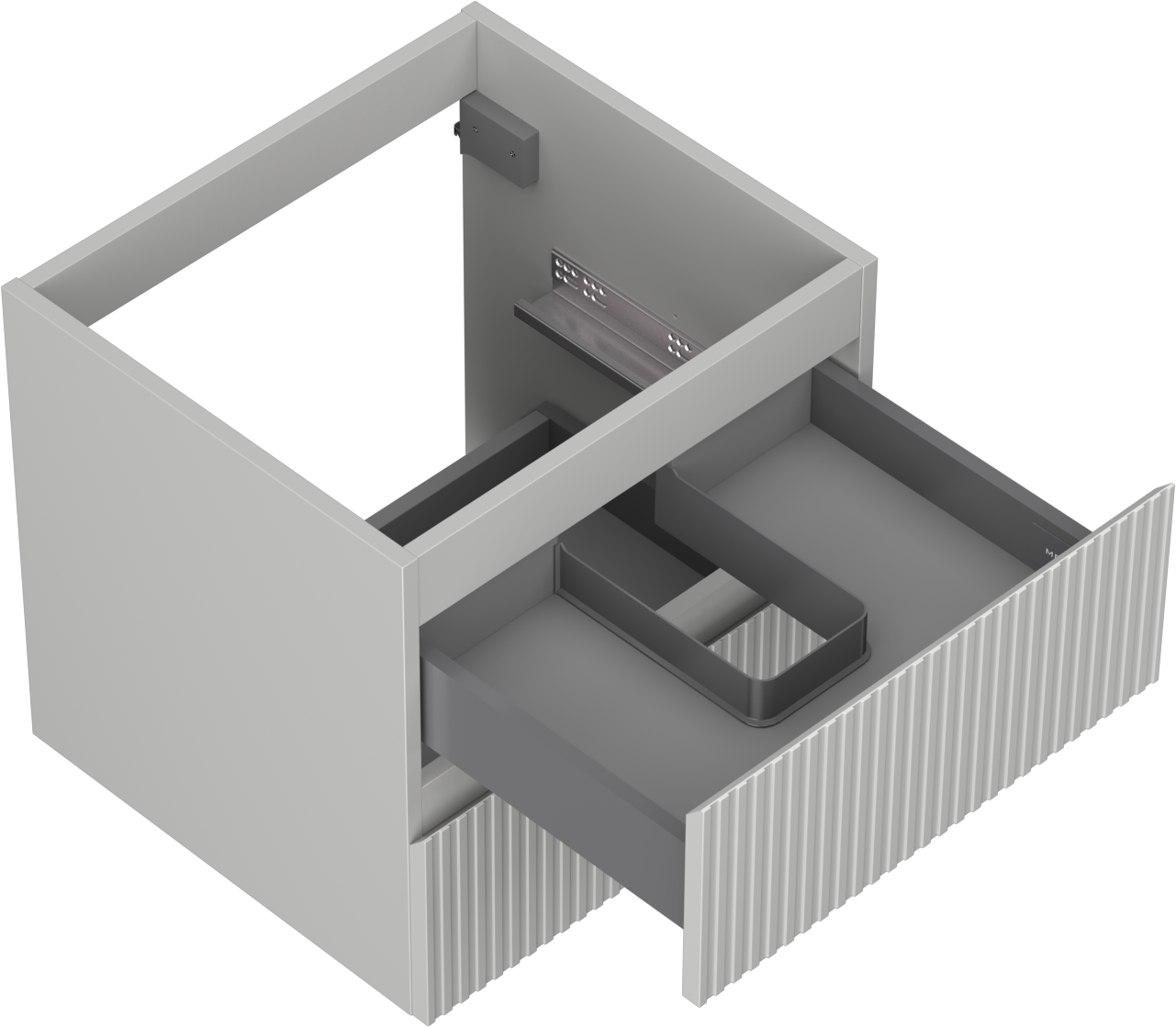 Wycięcie w szufladzie jest zaprojektowane w taki sposób, aby pomieścić syfon, który jest niezbędny w instalacjach umywalkowych. Dzięki temu mebel może być zamontowany w pełni funkcjonalnie, bez konieczności rezygnowania z przestrzeni w szufladzie na rzecz instalacji.