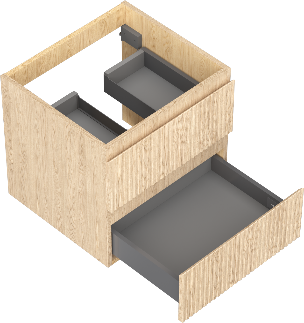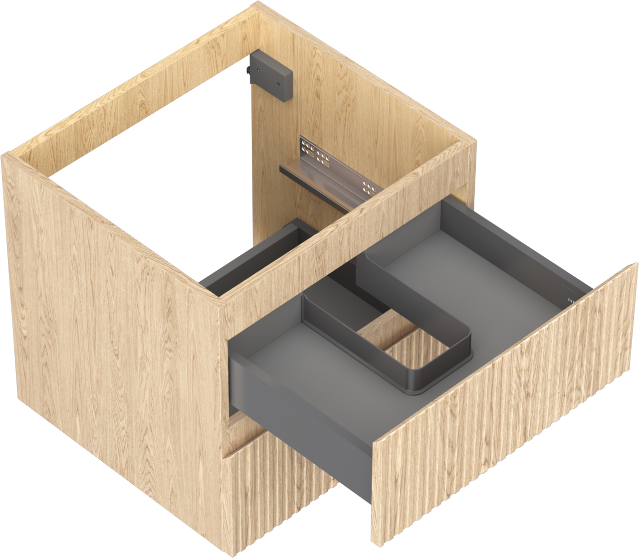 Wycięcie w szufladzie jest zaprojektowane w taki sposób, aby pomieścić syfon, który jest niezbędny w instalacjach umywalkowych. Dzięki temu mebel może być zamontowany w pełni funkcjonalnie, bez konieczności rezygnowania z przestrzeni w szufladzie na rzecz instalacji.
