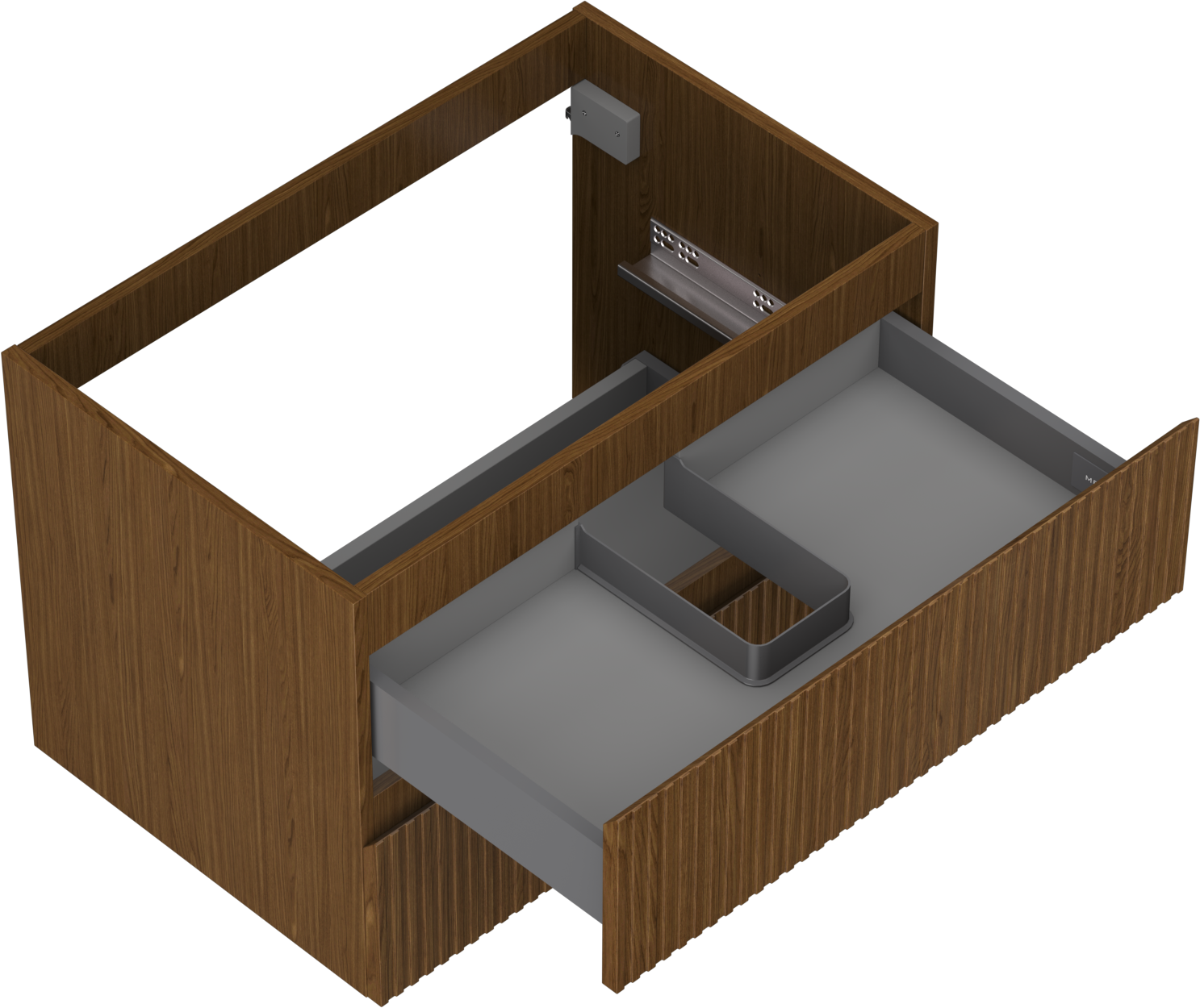 Wycięcie w szufladzie jest zaprojektowane w taki sposób, aby pomieścić syfon, który jest niezbędny w instalacjach umywalkowych. Dzięki temu mebel może być zamontowany w pełni funkcjonalnie, bez konieczności rezygnowania z przestrzeni w szufladzie na rzecz instalacji.