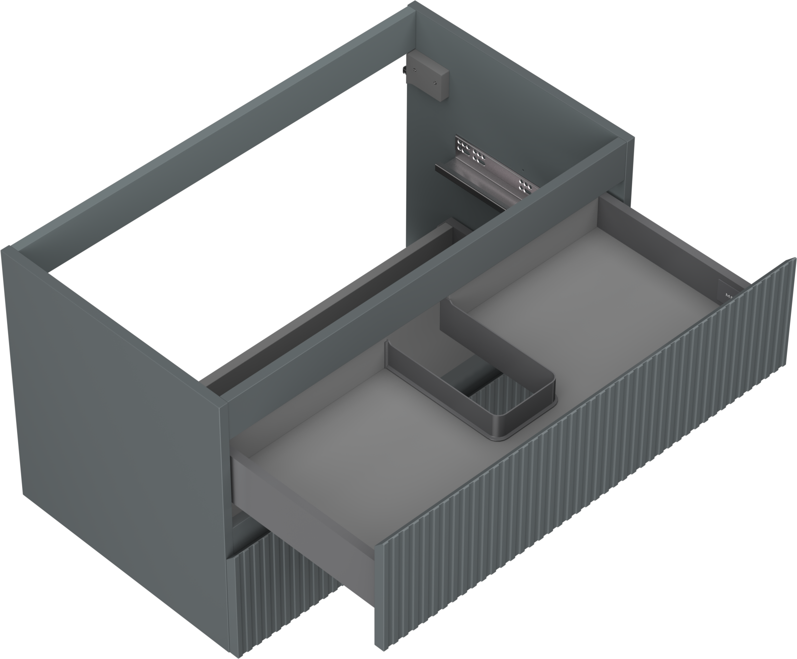 Wycięcie w szufladzie jest zaprojektowane w taki sposób, aby pomieścić syfon, który jest niezbędny w instalacjach umywalkowych. Dzięki temu mebel może być zamontowany w pełni funkcjonalnie, bez konieczności rezygnowania z przestrzeni w szufladzie na rzecz instalacji.