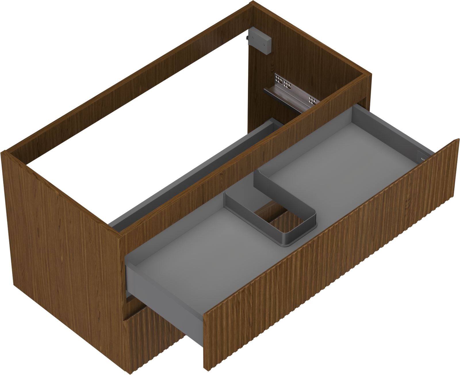 Wycięcie w szufladzie jest zaprojektowane w taki sposób, aby pomieścić syfon, który jest niezbędny w instalacjach umywalkowych. Dzięki temu mebel może być zamontowany w pełni funkcjonalnie, bez konieczności rezygnowania z przestrzeni w szufladzie na rzecz instalacji.