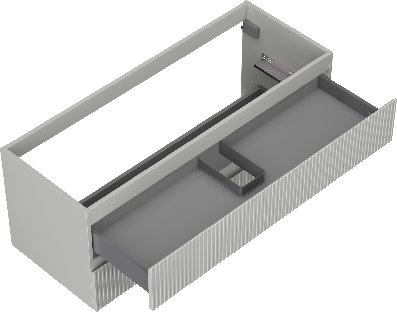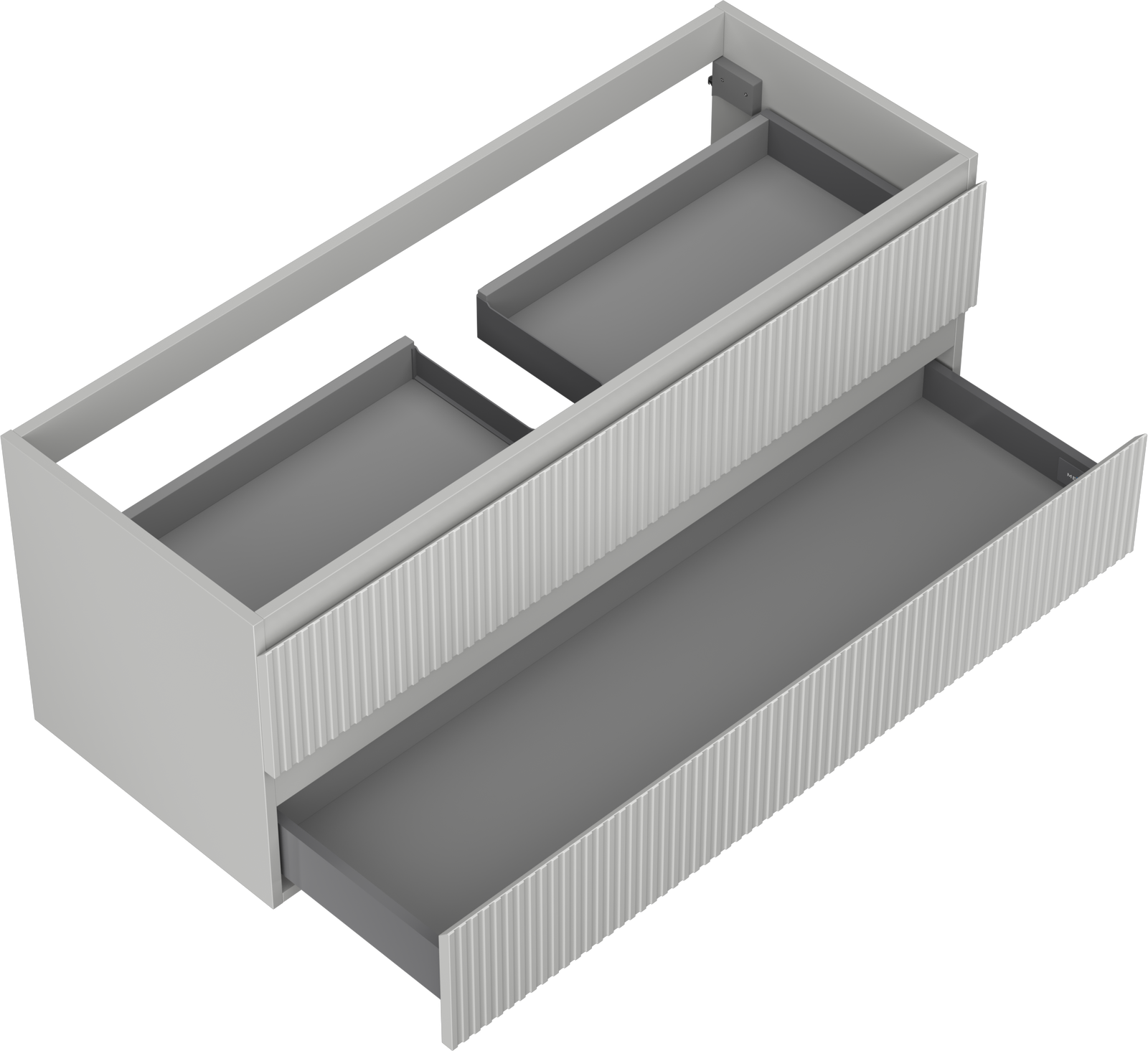 Specyfikacja produktu: Szerokość: 120 cm Wysokość: 47 cm Głębokość: 46 cm Kolor korpus: Szary mat Materiał korpus: Płyta lakierowana Kolor front: Szary mat Materiał front: Płyta MDF lakierowana Struktura frontu: Ryflowana Ilość szuflad: 2 Przestronna szuflada z funkcją cichego domyku Pełny wysuw ułatwiający dostęp do zawartości szuflad Powierzchnia odporna na promienie UV Do kompletowania z blatem lub umywalką Otis, Vela Produkt zmontowany