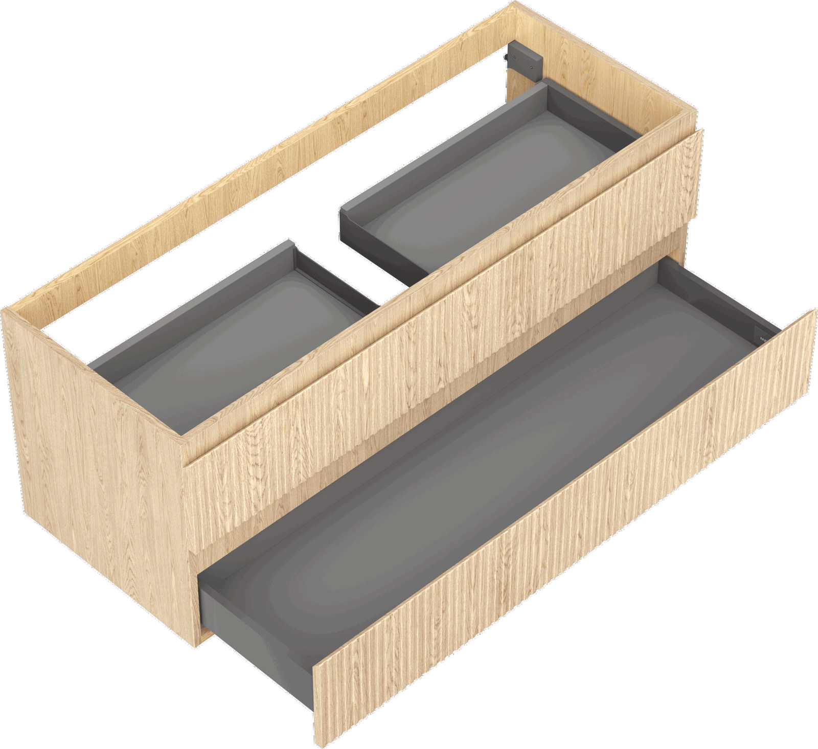Wycięcie w szufladzie jest zaprojektowane w taki sposób, aby pomieścić syfon, który jest niezbędny w instalacjach umywalkowych. Dzięki temu mebel może być zamontowany w pełni funkcjonalnie, bez konieczności rezygnowania z przestrzeni w szufladzie na rzecz instalacji.
