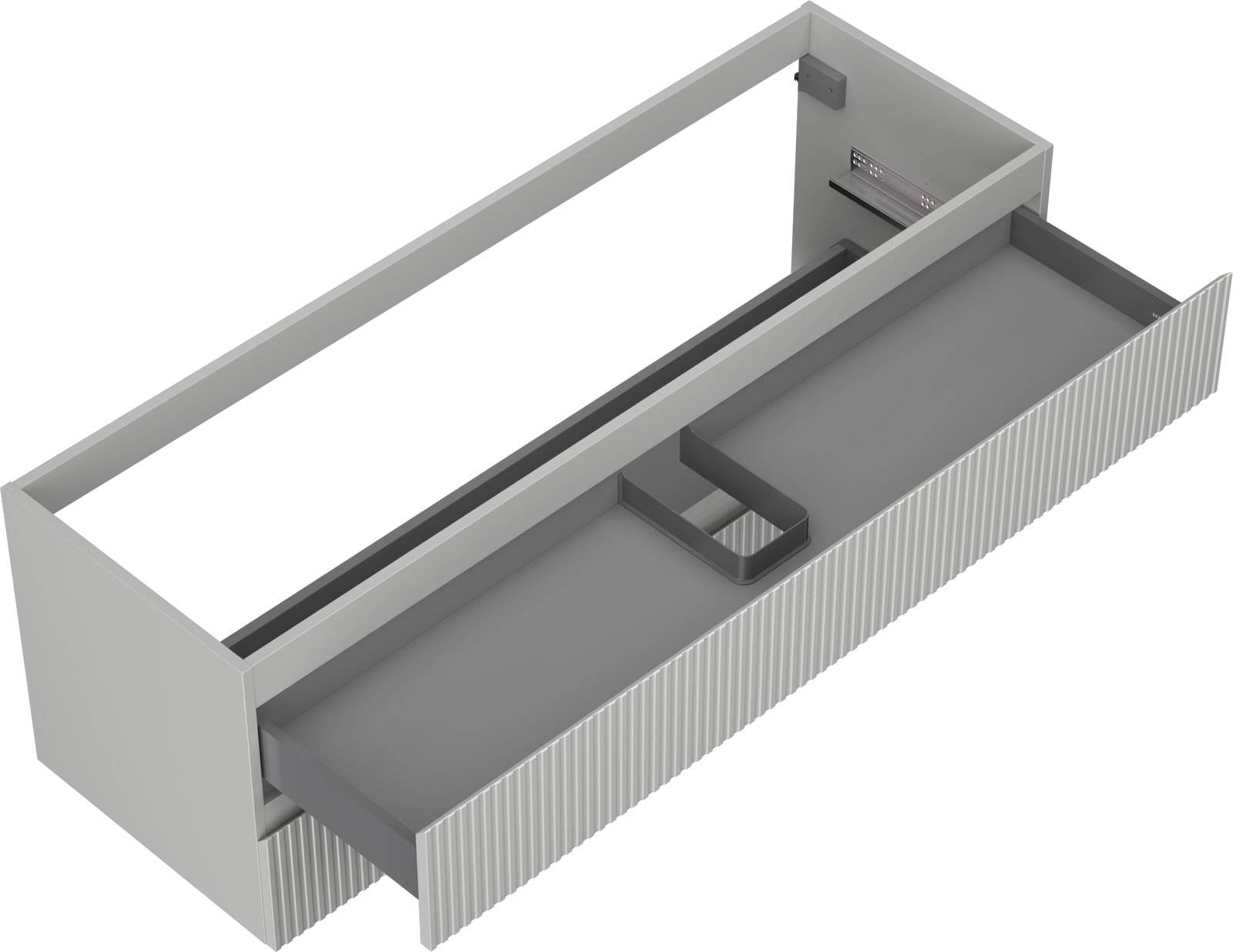 Wycięcie w szufladzie jest zaprojektowane w taki sposób, aby pomieścić syfon, który jest niezbędny w instalacjach umywalkowych. Dzięki temu mebel może być zamontowany w pełni funkcjonalnie, bez konieczności rezygnowania z przestrzeni w szufladzie na rzecz instalacji.