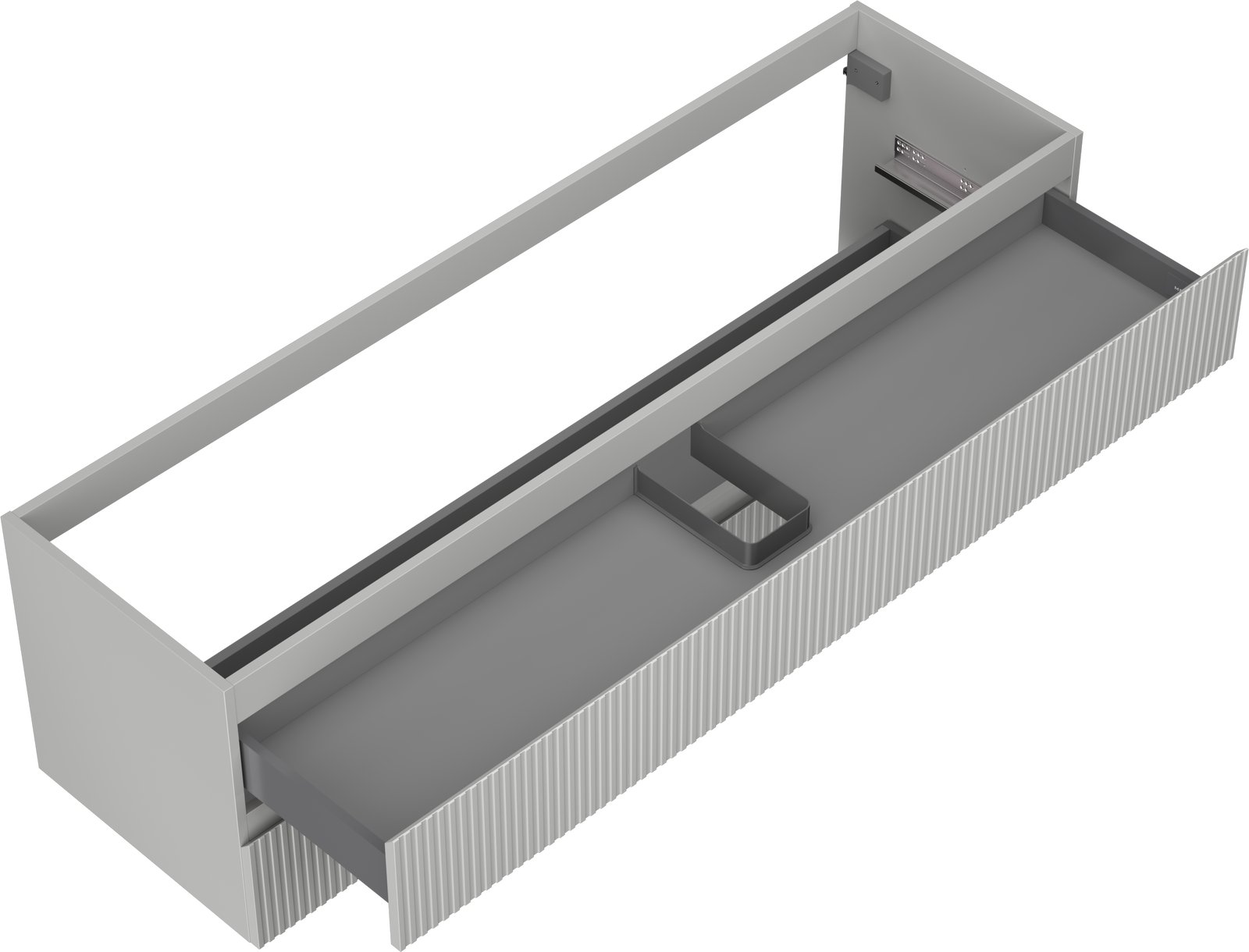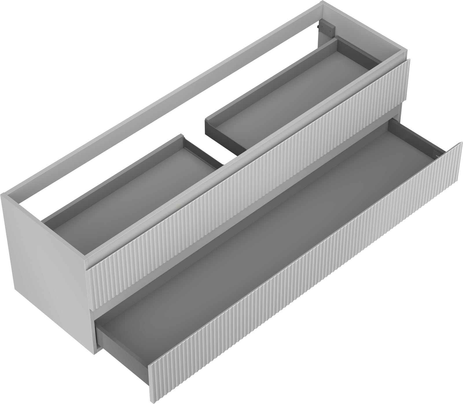 Specyfikacja produktu: Szerokość: 160 cm Wysokość: 47 cm Głębokość: 46 cm Kolor korpus: Szary mat Materiał korpus: Płyta lakierowana Kolor front: Szary mat Materiał front: Płyta MDF lakierowana Struktura frontu: Ryflowana Ilość szuflad: 2 Przestronna szuflada z funkcją cichego domyku Pełny wysuw ułatwiający dostęp do zawartości szuflad Powierzchnia odporna na promienie UV Do kompletowania z blatem lub umywalką Otis, Vela Produkt zmontowany