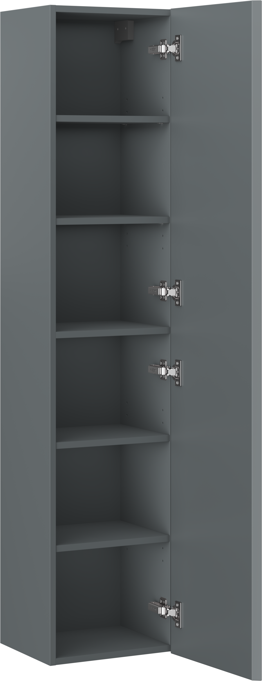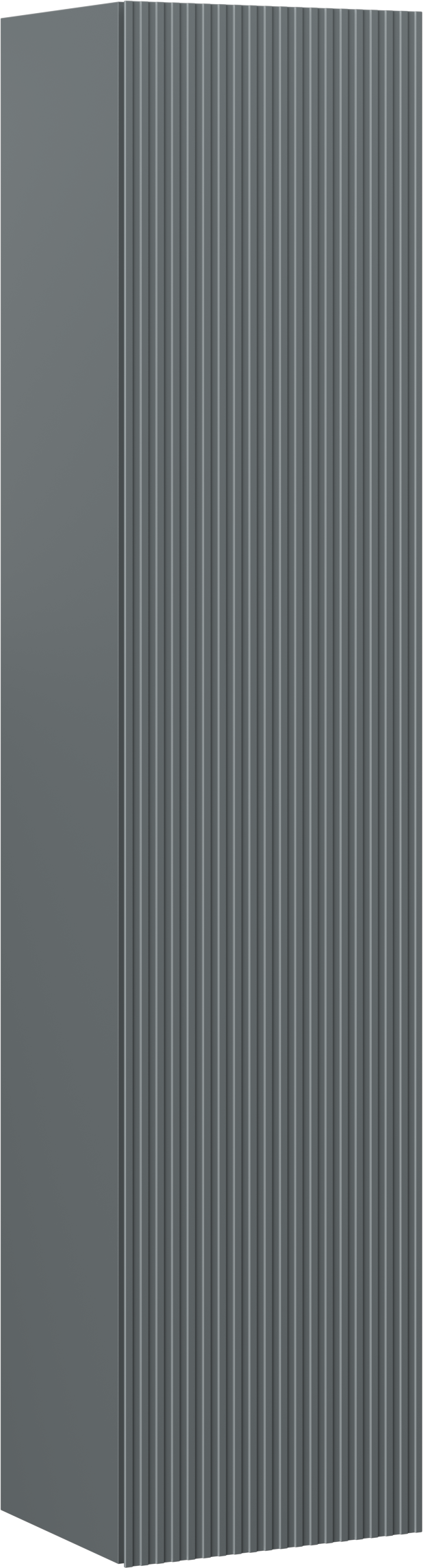Specyfikacja produktu: Szerokość: 35 cm Wysokość: 160 cm Głębokość: 30 cm Kolor korpus: Grafit mat Materiał korpus: Płyta lakierowana Kolor front: Grafit mat Materiał front: Płyta MDF lakierowana Struktura frontu: Ryflowana Ilość drzwi: 1 5 półek (1 półka środkowa stała oraz 4 półki z możliwością regulacji) Zawiasy z funkcją cichego domyku Uniwersalny montaż drzwi (lewo/prawo) Powierzchnia odporna na promienie UV Produkt zmontowany